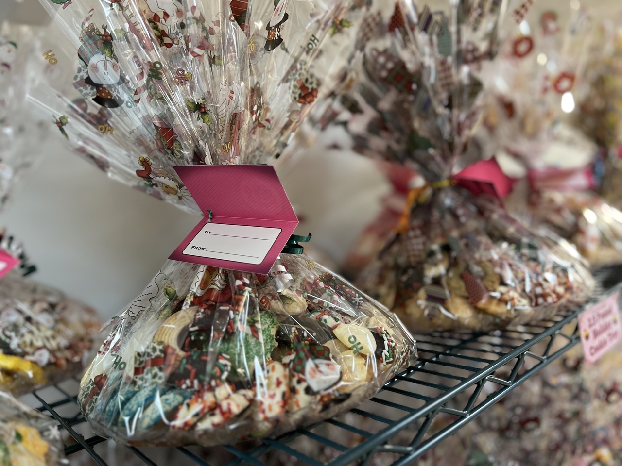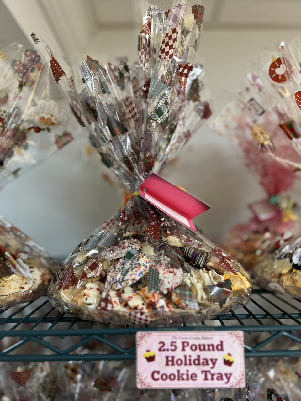 A 2.5 LB assortment of our assorted holiday cookies, arranged on a tray and wrapped with holiday cellophane, ribbons, and a gift tag. A customer favorite holiday gift and a great corporate/business gift!