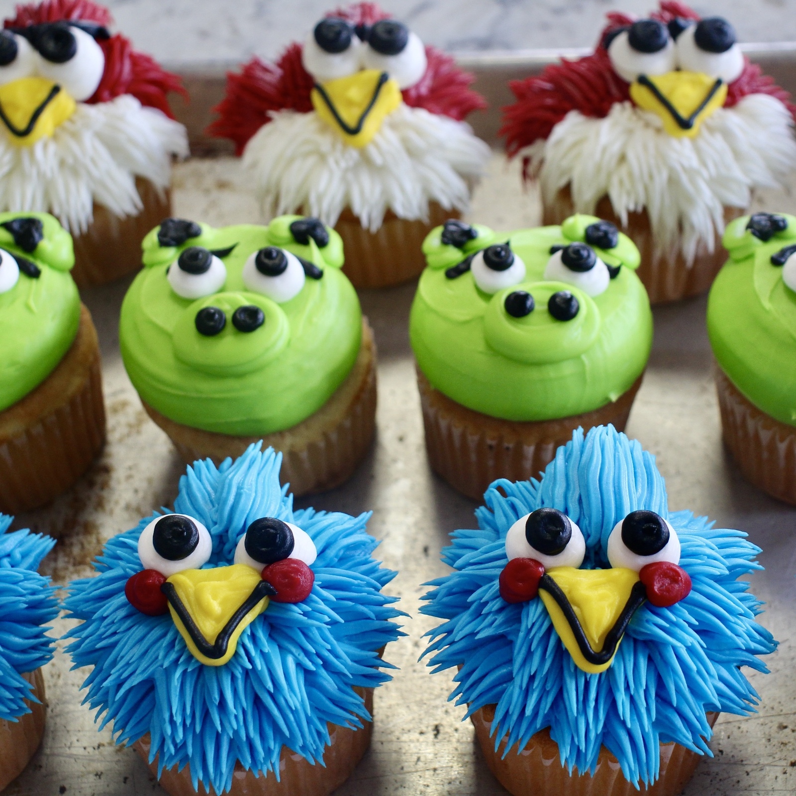 A tribute to the popular game, Angry Birds! Our moist (yellow or chocolate) cupcakes topped with piped faces of the Angry Bird characters.