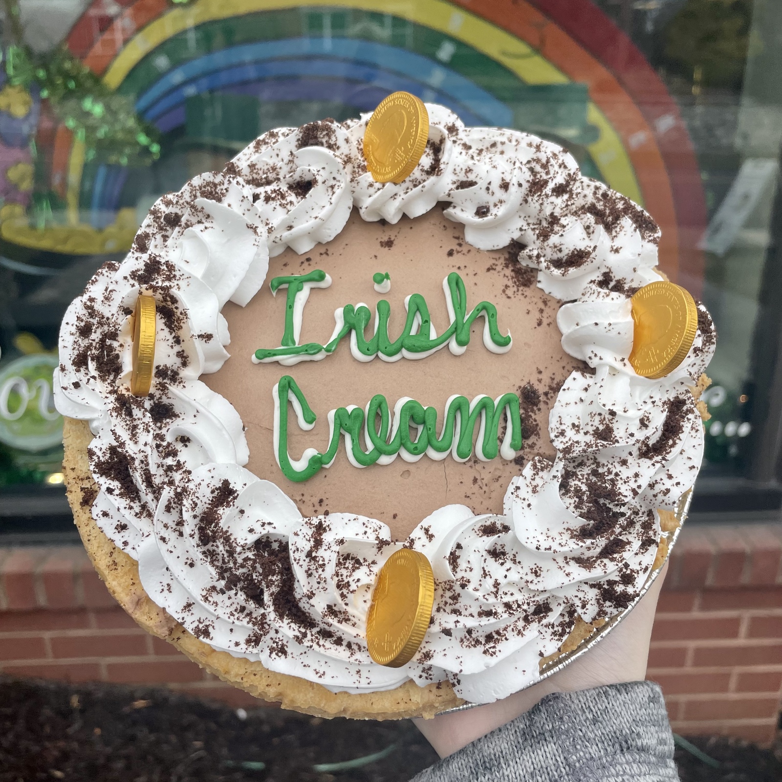 A pie shell filled with a Bailey's Irish cream Chocolate custard, topped with whipped cream, and garnished with chocolate shavings, and chocolate coins. A St. Patty's Day favorite! 6 inch pie - serves 2-4.