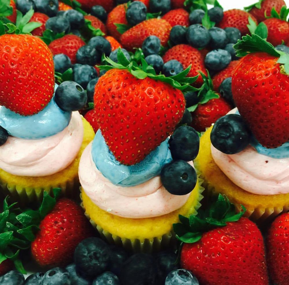 A moist white cake topped with a strawberry buttercream and blueberry buttercream, and garnished with fresh strawberries and blueberries. A featured flavor for the week of July 4th!