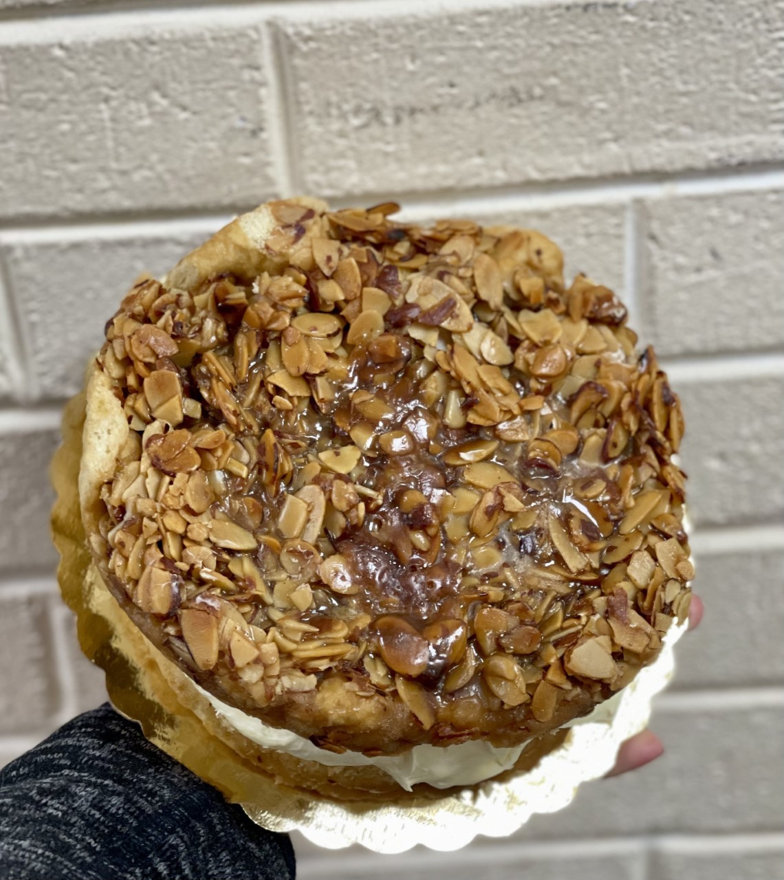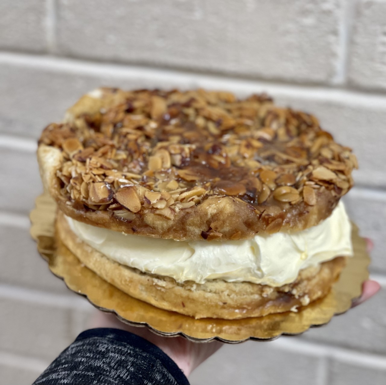 A traditional "German Honey Bee Cake." Two layers of pastry filled with a pastry cream center and covered in honey and almonds.