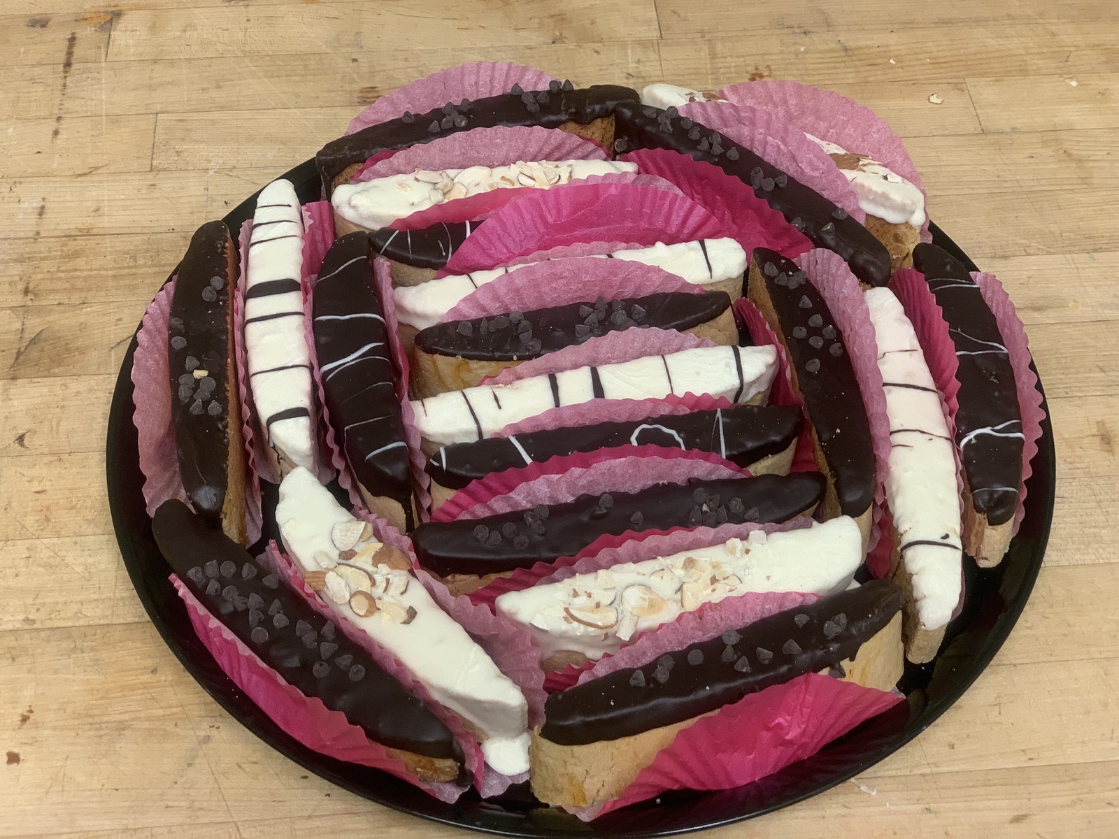 An assortment of 20 of our home-made biscotti, all served on a catering tray. A perfect accompaniment to a meeting involving coffee.