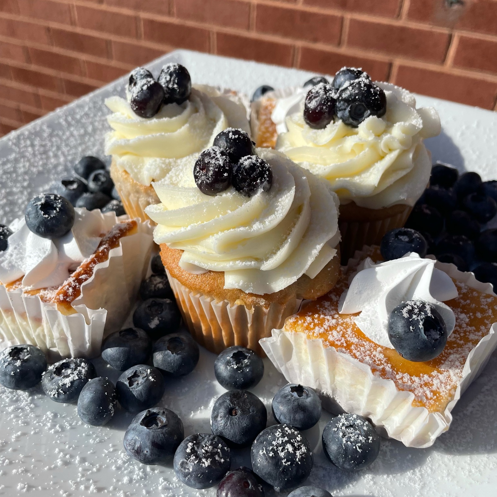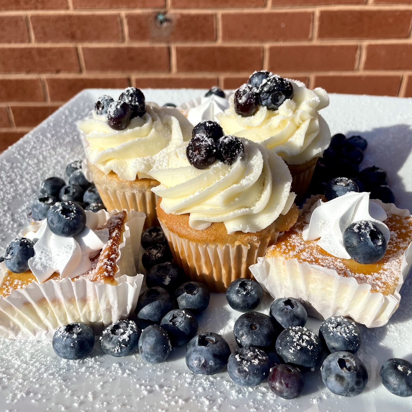 Our blueberry-flavored cake with cream cheese baked in, topped with a swirl of French buttercream, & garnished with fresh blueberries. A delightful Spring favorite flavor.