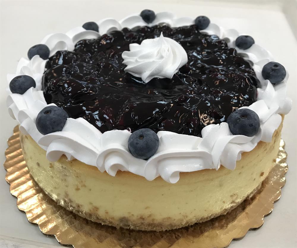 Our creamy New York style cheesecake topped with fresh blueberry filling and whipped cream.