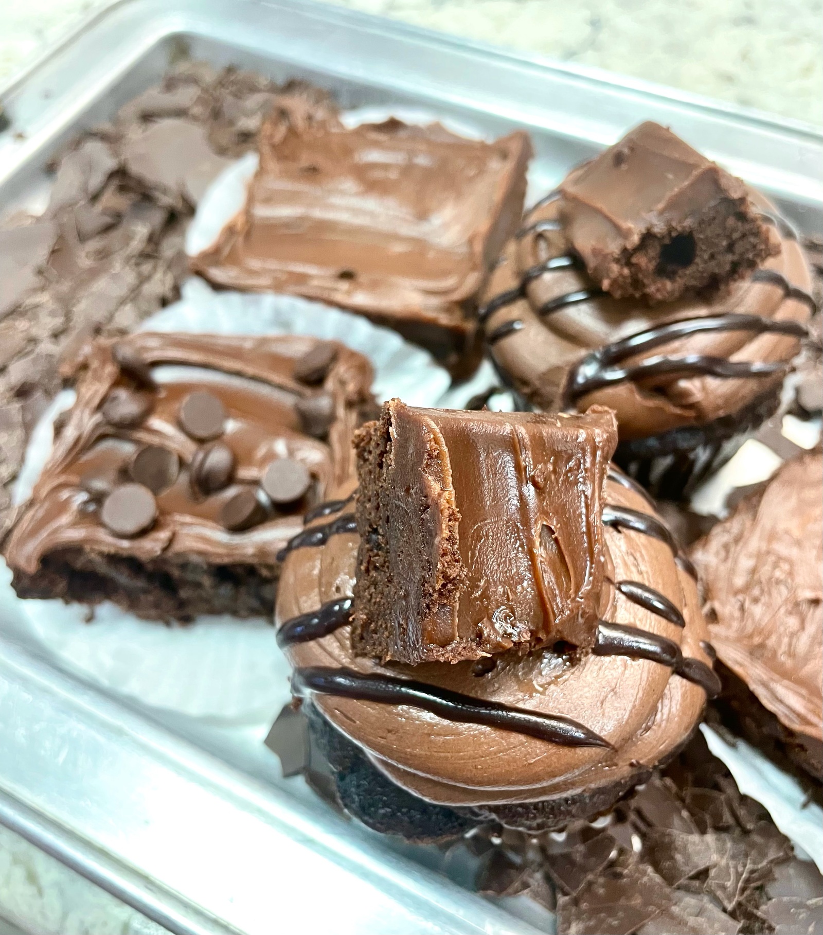 Our moist devil's food cake, filled with edible brownie batter, & then topped with rich fudge icing. It's then finished off with a ganache drizzle, & a delectable brownie bite.
