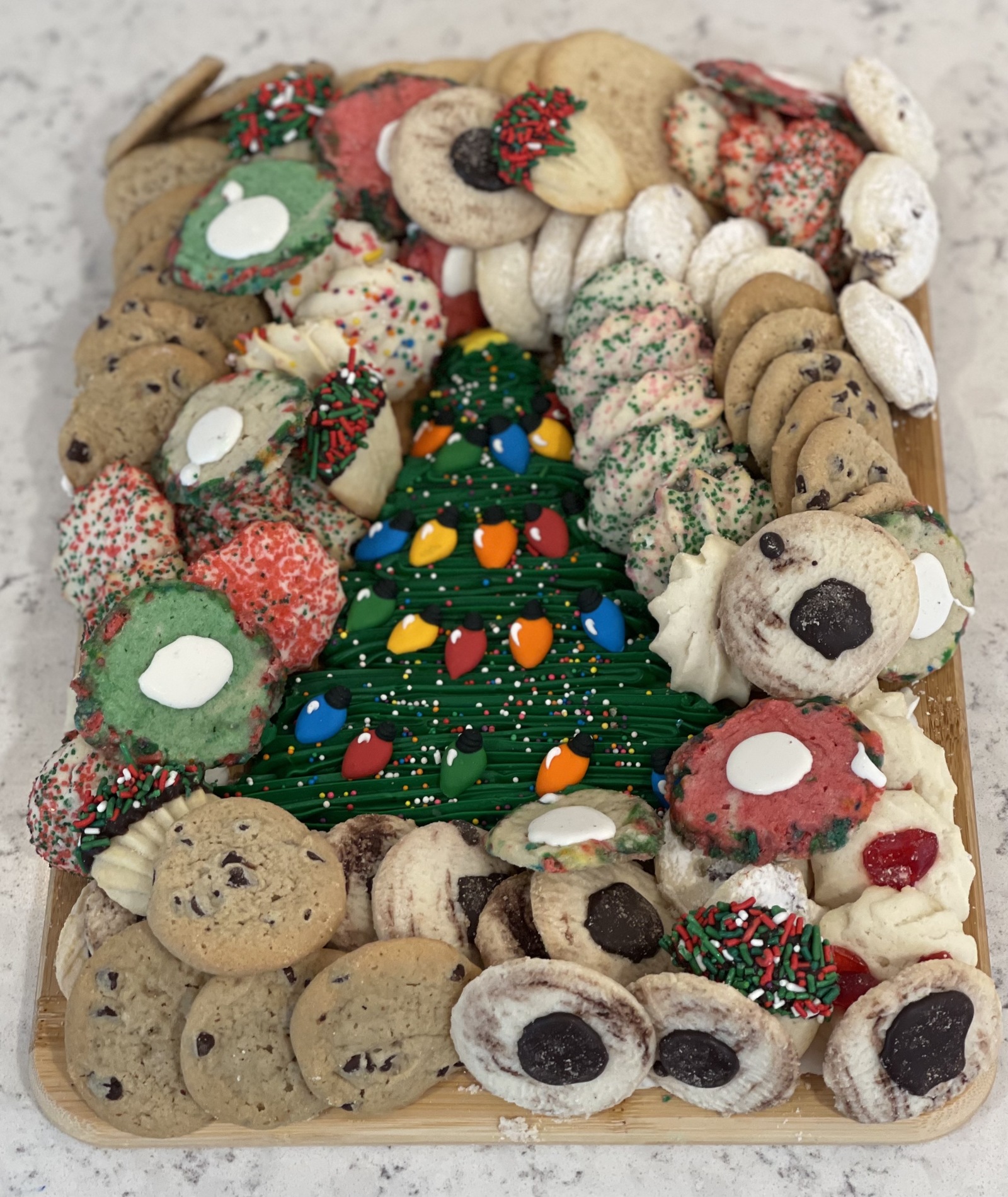 Our NEW BUTTER(Cream) Board option! One of our real bamboo charcuterie boards, topped with a buttercream Holiday tree, & surrounded by an assortment of fresh baked holiday Cookies. Dip the cookies in the buttercream tree for an extra special treat! :)