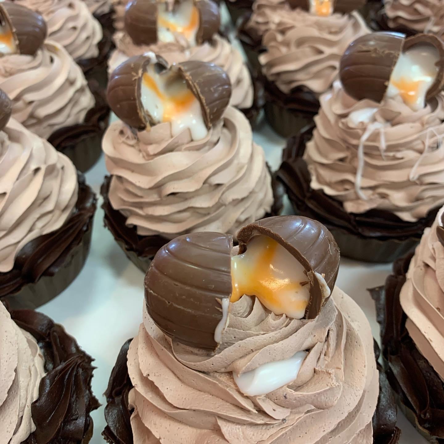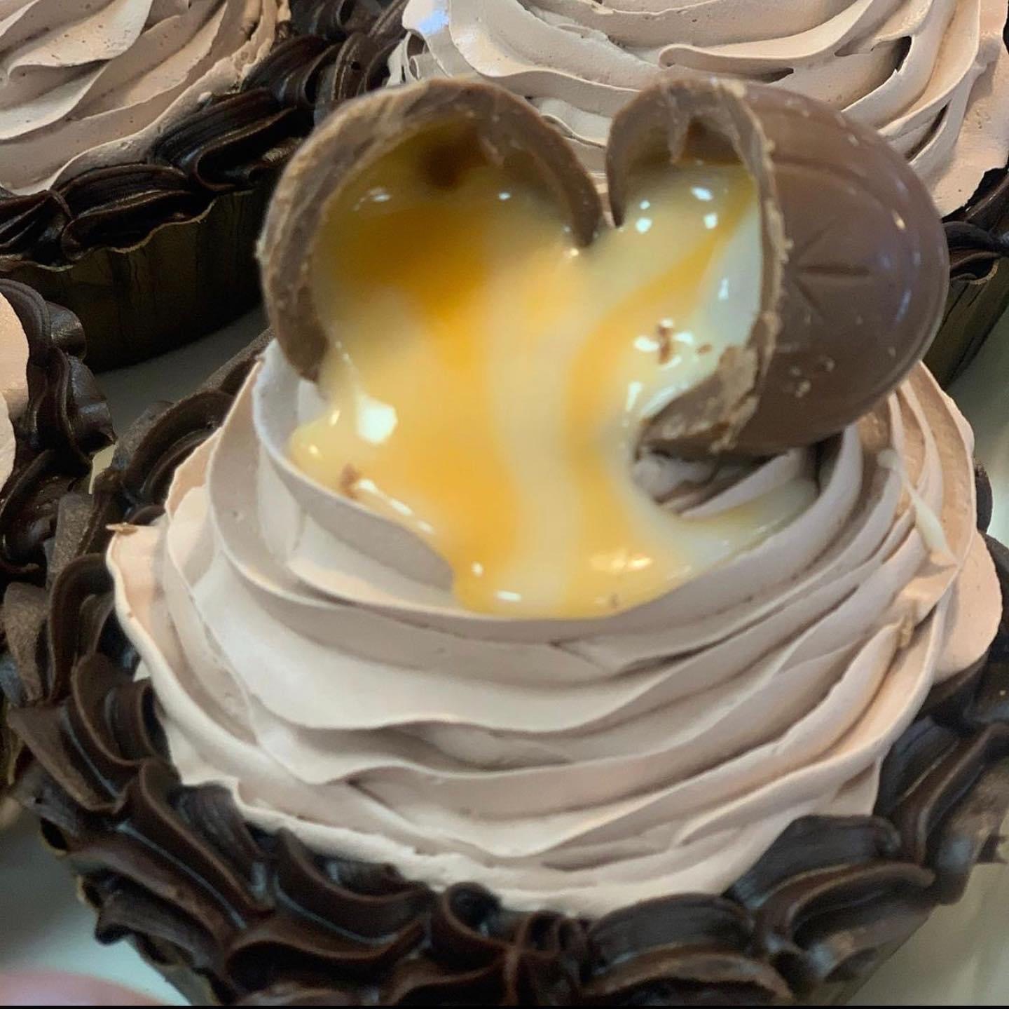 A rich chocolate brownie, topped with chocolate mousse, and a cadbury egg filling in middle, topped with a real cadbury egg.