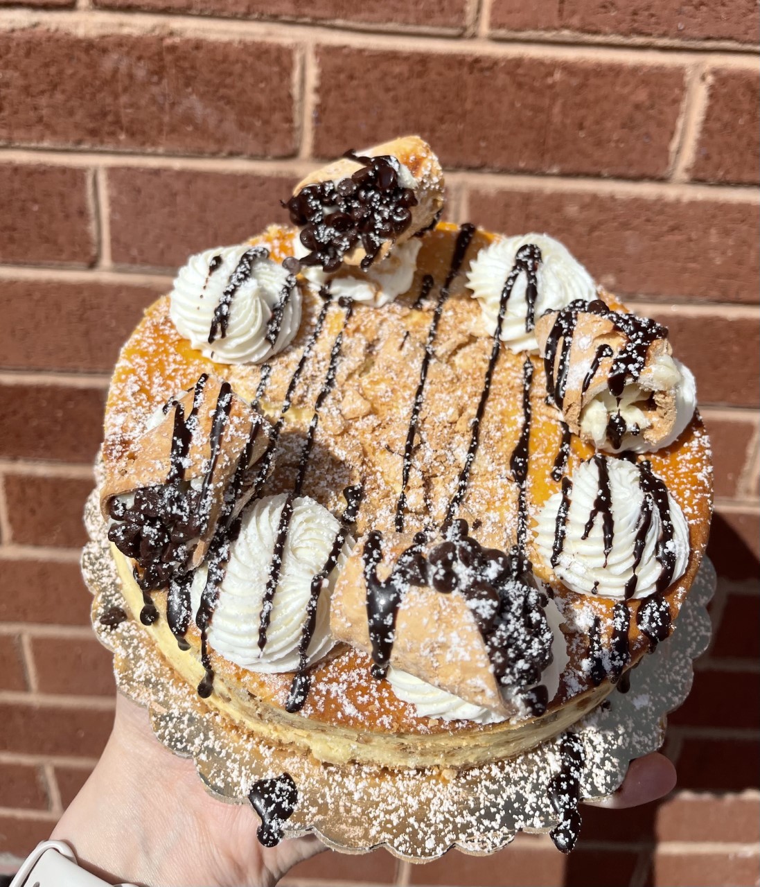 Our own creamy New York style cheesecake with a crushed cannoli shell base, swirled with cannoli ricotta filling. Topped with cream cheese and pieces of cannoli halves.