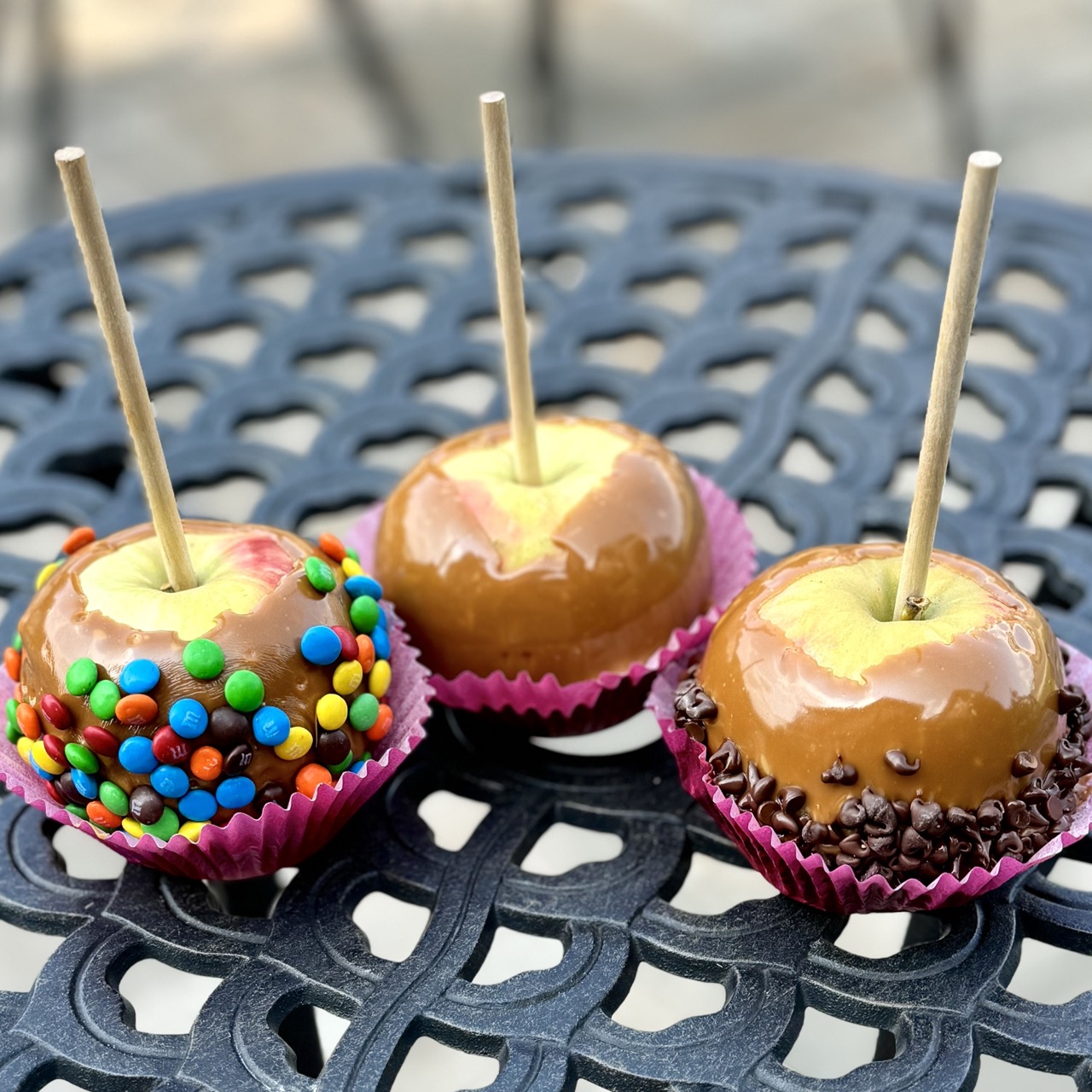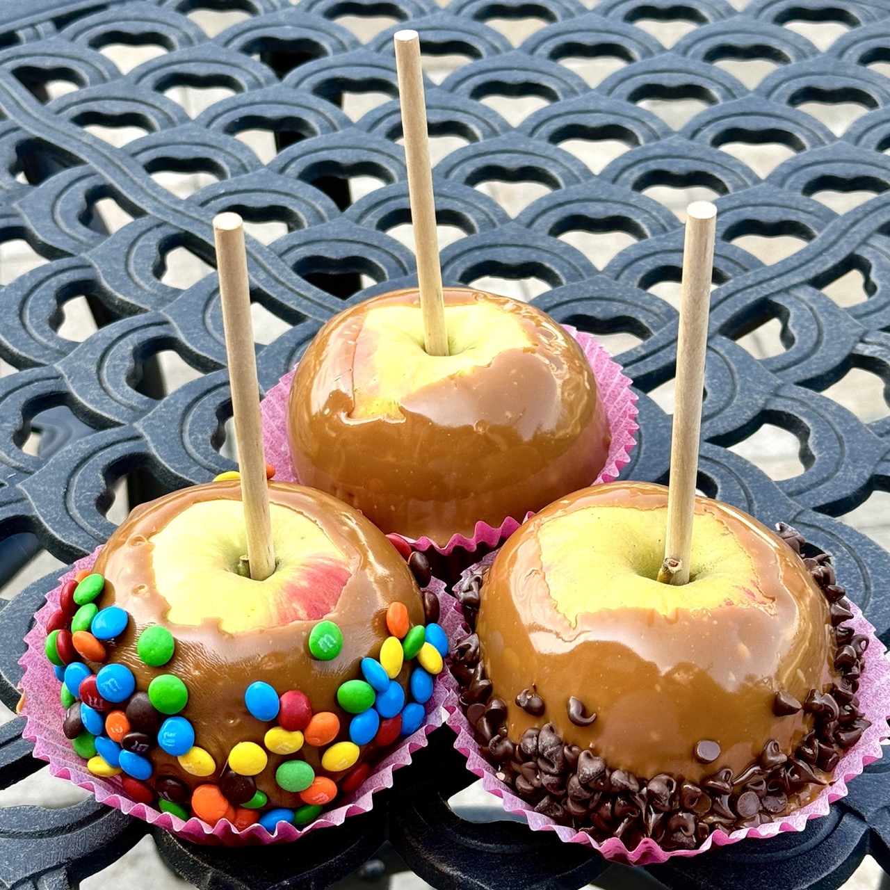 A large locally grown apple, dipped in our homemade caramel and rolled in chopped peanuts, mini M 'n Ms, or Chocolate Chips! A Fall Must-Have! Please indicate toppings when ordering!