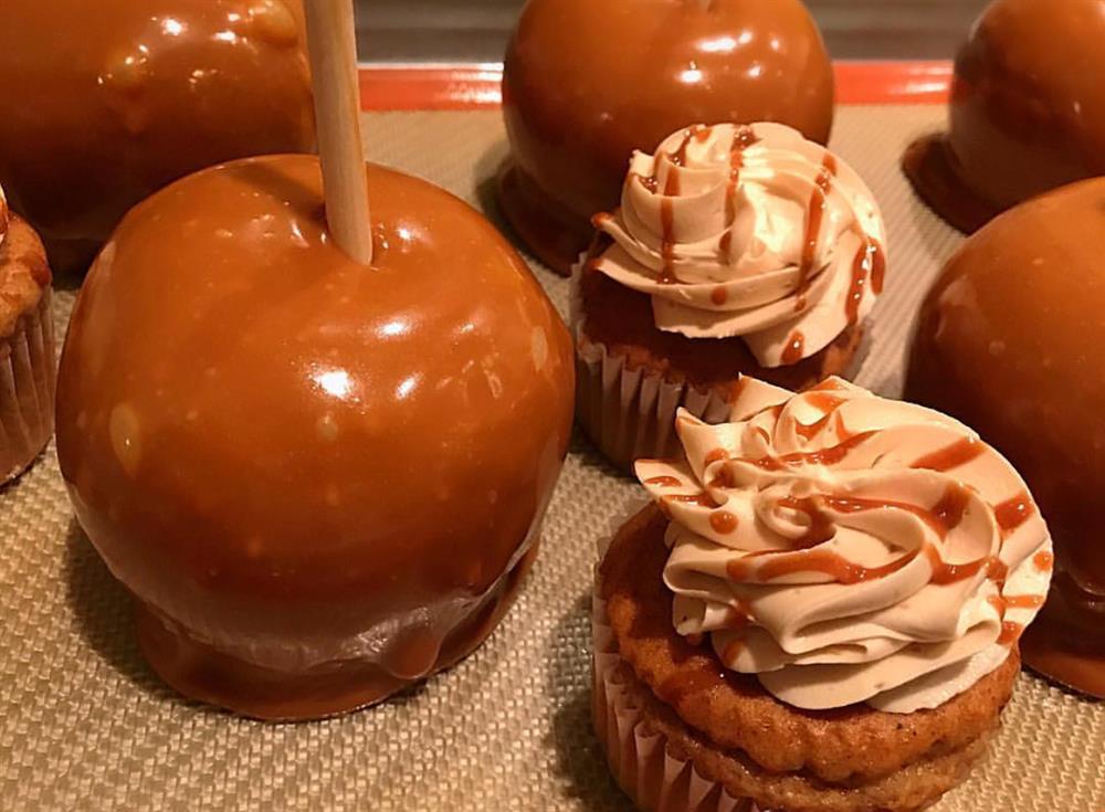 A fresh and moist apple spice cupcake, iced with a caramel buttercream and drizzled caramel. A FALL favorite!