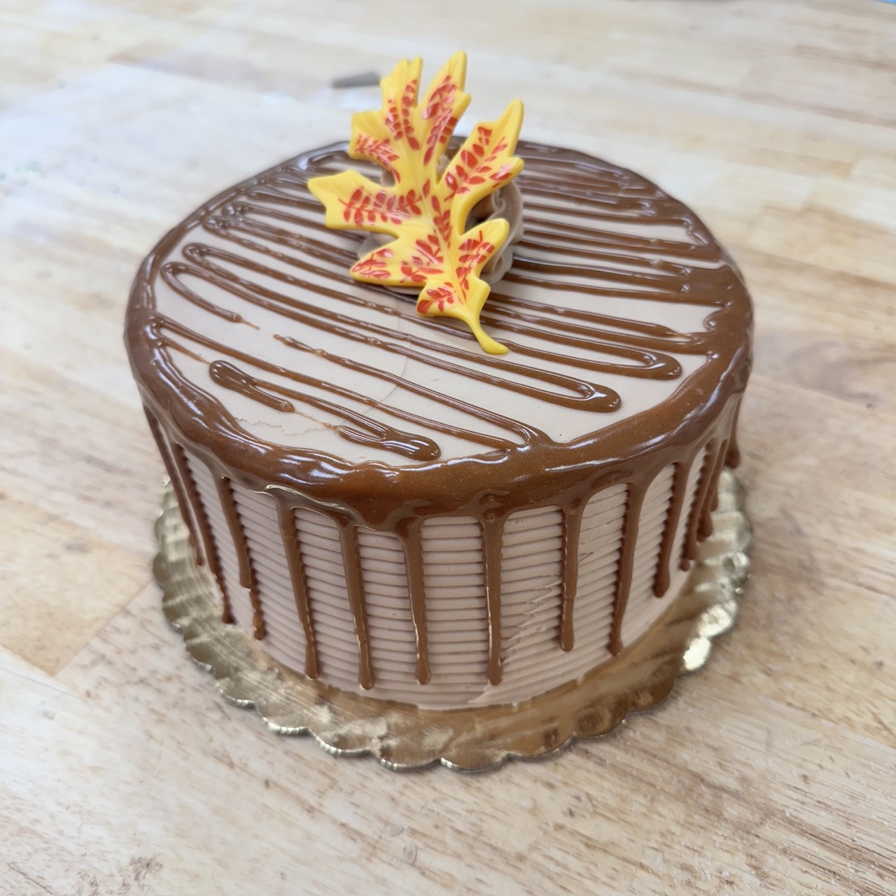 Layers of apple spice cake, filled and topped with fresh apple cinnamon filling, and iced with caramel buttercream with a caramel drizzle. Serves 6-8.