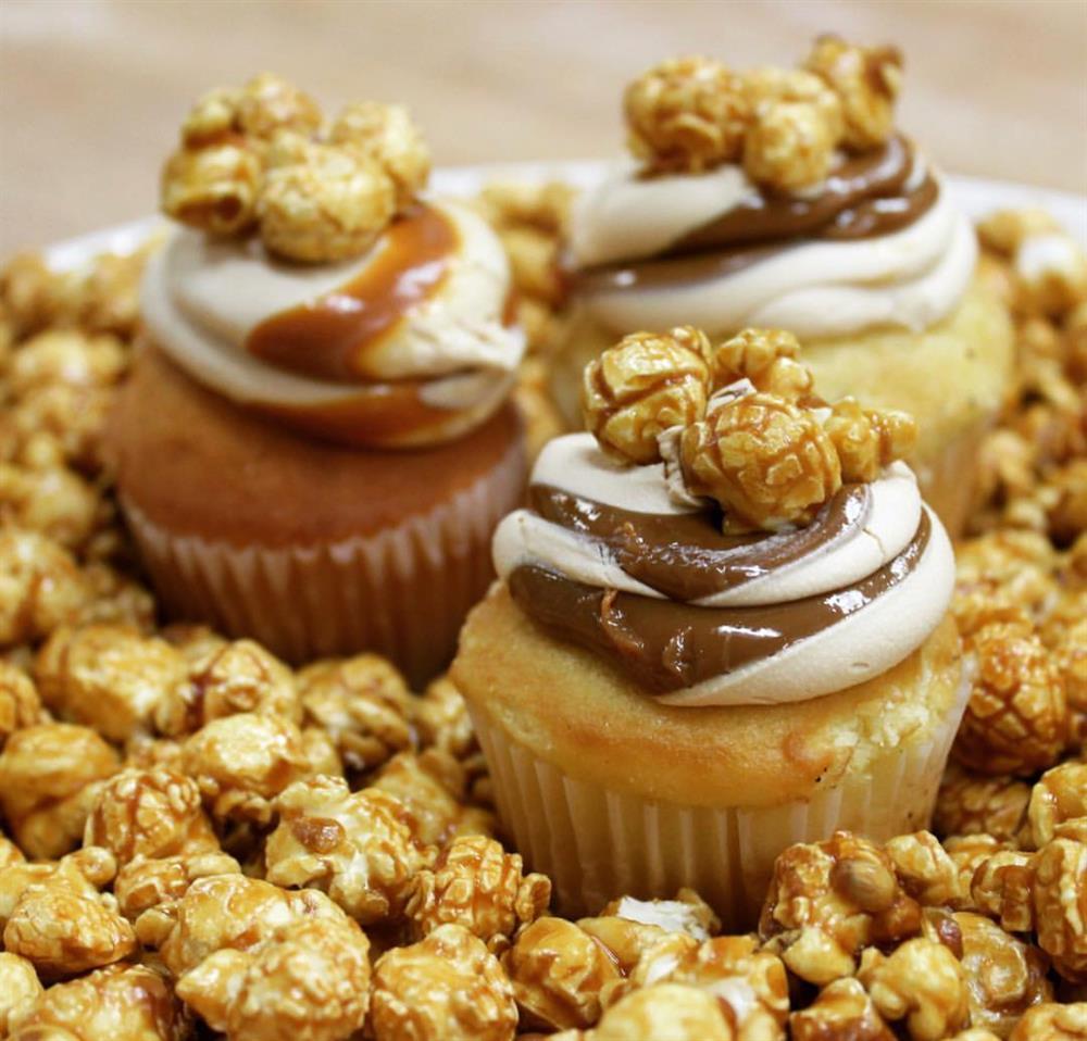 A yellow cupcake topped with a caramel dulce de leech buttercream icing, and finished off with caramel corn pieces.