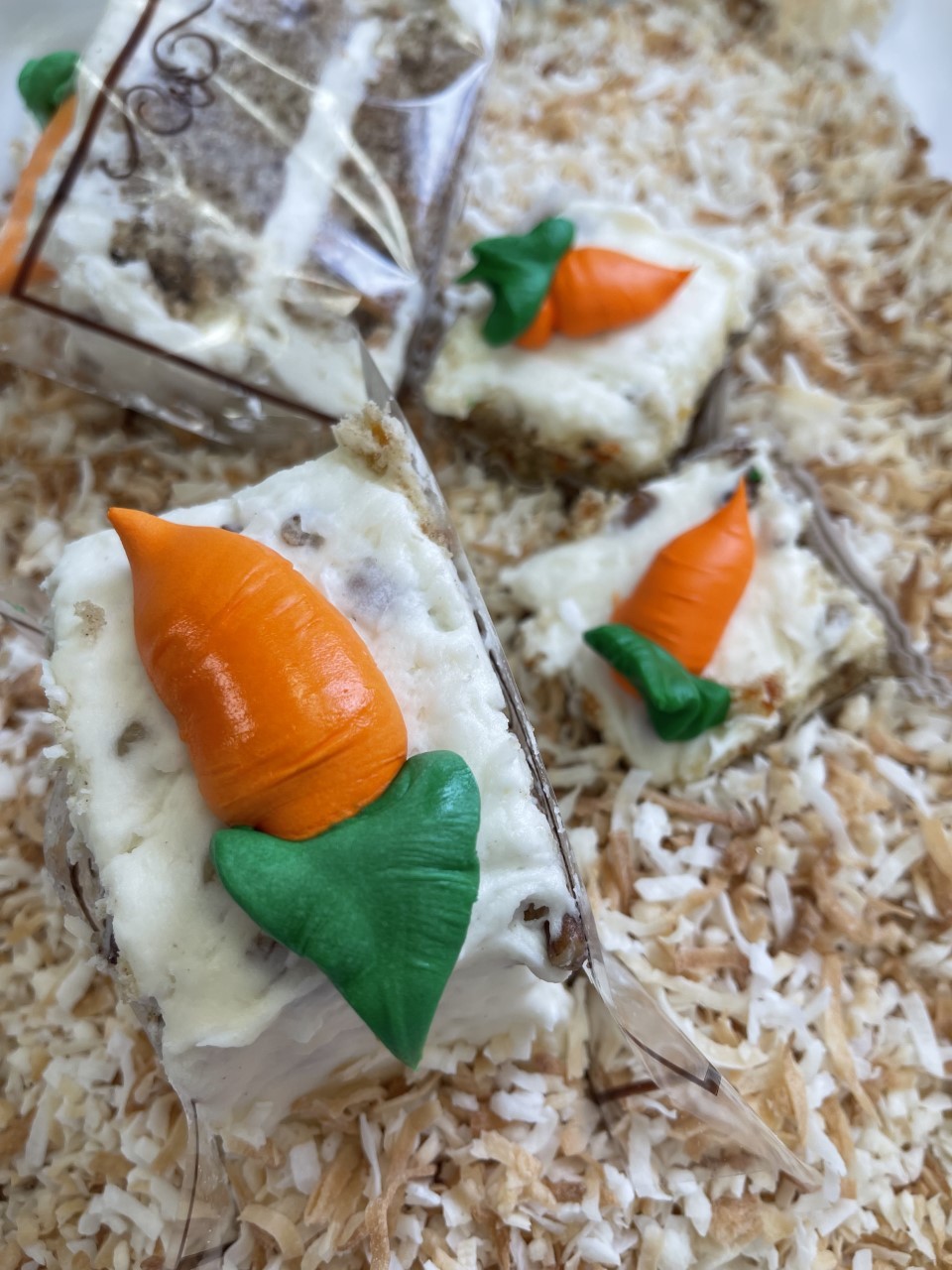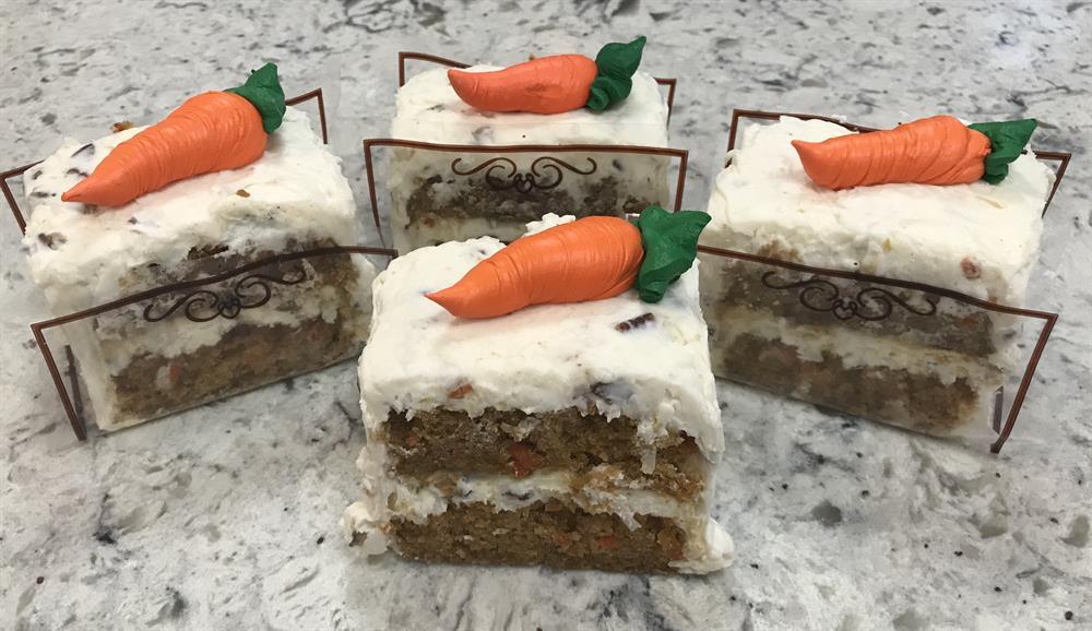 Layers of our made-from-scratch carrot cake, filled and iced with our smooth cream cheese icing with chopped nuts and coconut and garnished with a buttercream carrot.