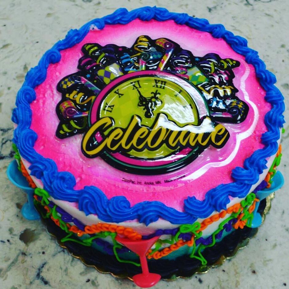 A 7 inch cake (serves 6-8), iced in buttercream, and decorated with bright colors, and a New Year's clock face celebrate sign. When ordering, please specify your flavor selection - including: yellow cake, chocolate cake, marble cake, or 1/2 and 1/2 (layer of chocolate and layer of yellow).
