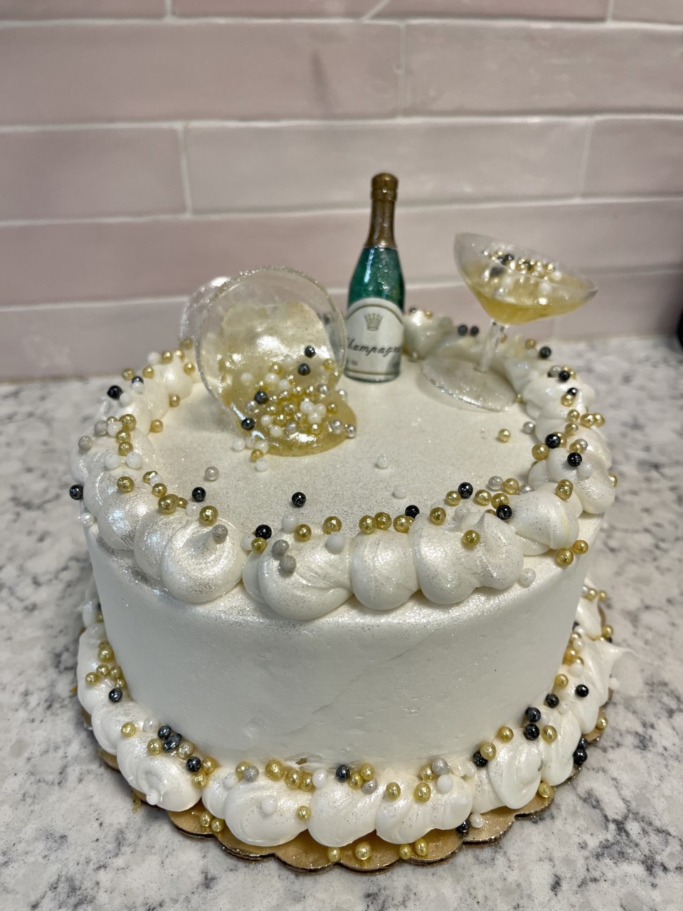 A 7 inch cake (serves 6-8), iced in buttercream, and decorated with black and white buttercream flowers, and a New Year's clock face and champagne glasses on top. When ordering, please specify your flavor selection - including: yellow cake, chocolate cake, marble cake, or 1/2 and 1/2 (layer of chocolate and layer of yellow).