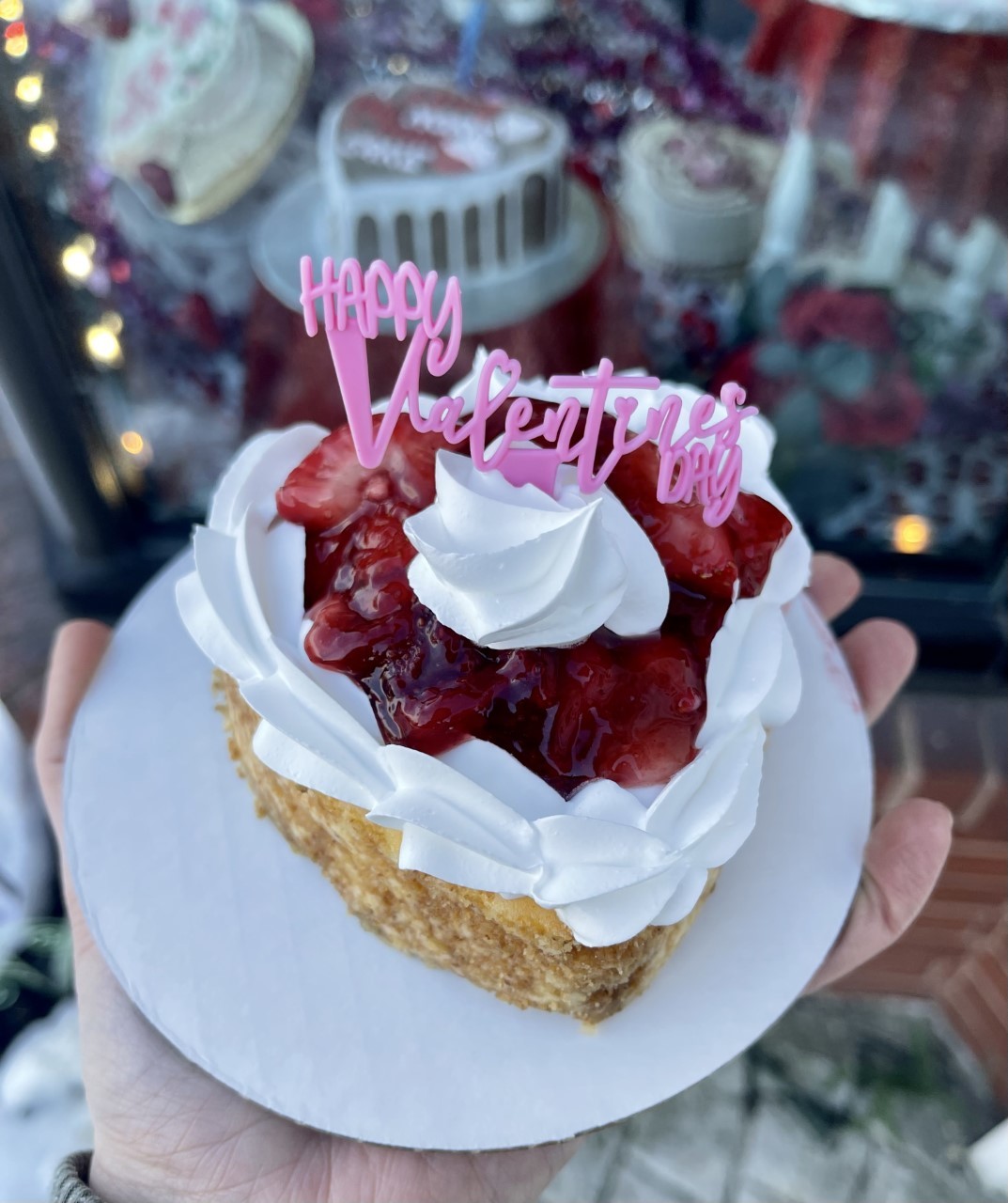 A slightly larger hear-shaped plain cheesecake, topped with a generous helping of strawberry filling and whipped cream. Serves 2.