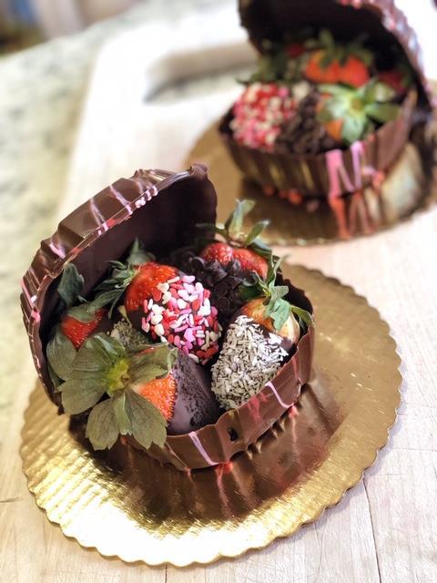 A hand-made square chocolate box filled with 4-6 assorted chocolate covered strawberries.