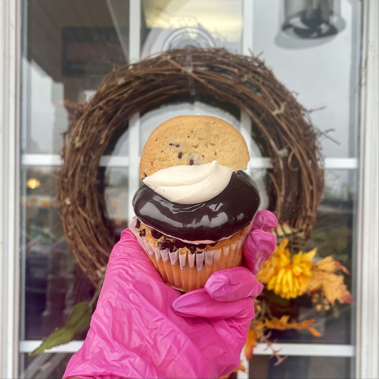 Our yellow cake with chocolate chips baked in, filled with real cookie dough, dipped in chocolate ganache, and topped with more cookie dough and a chocolate chip cookie.