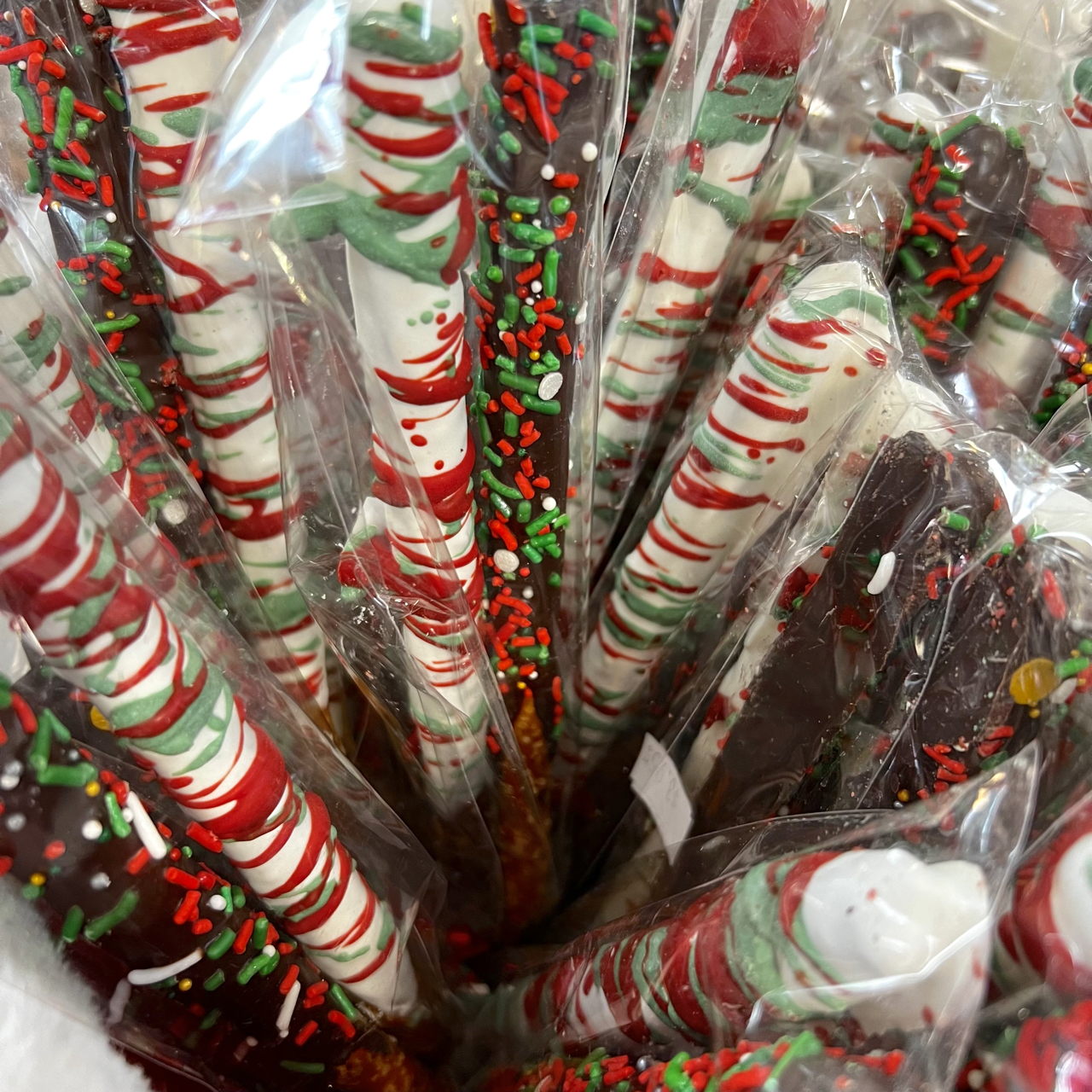 A 2-pack of hand-dipped chocolate-covered pretzel rods, bagged and ribboned. A perfect stocking stuffer.