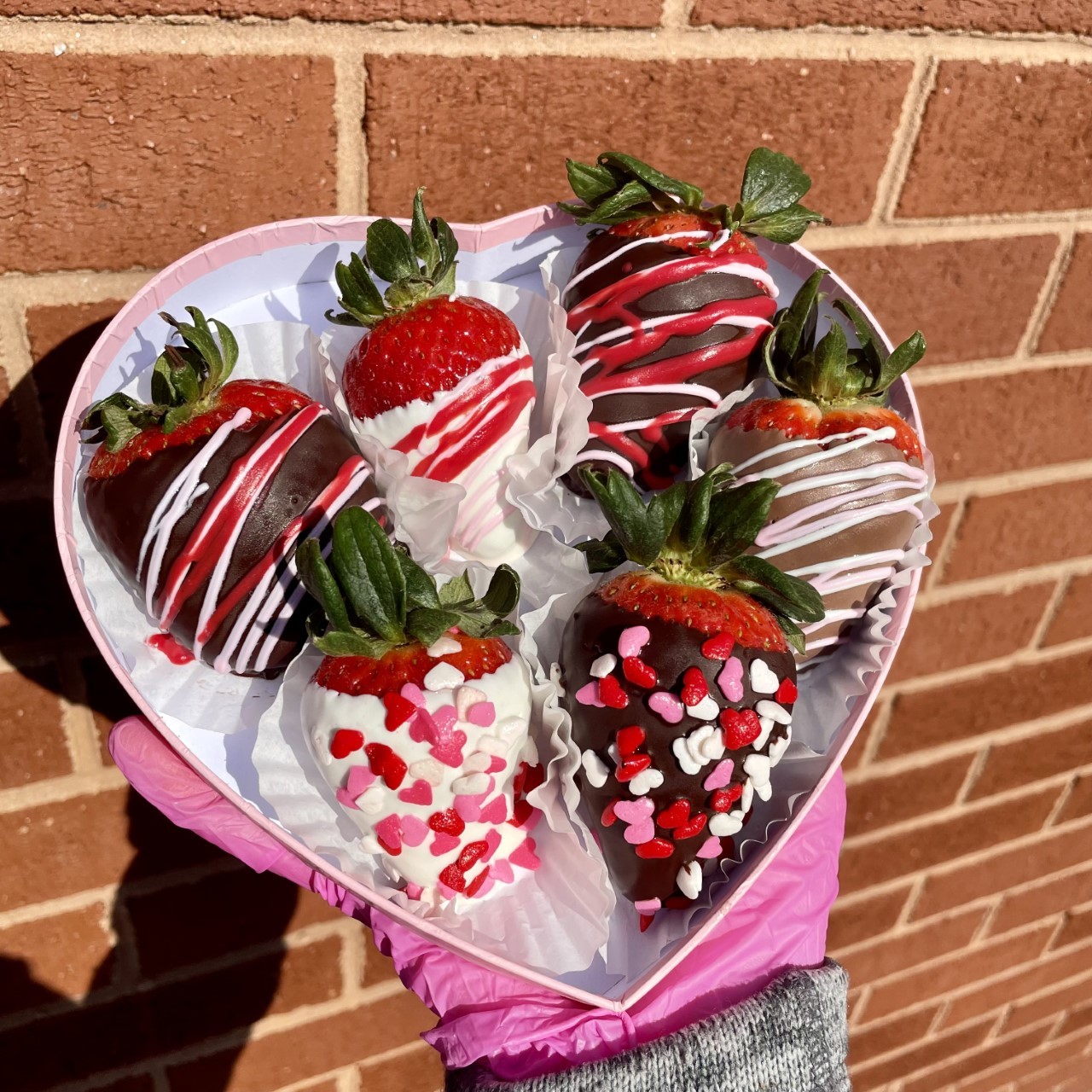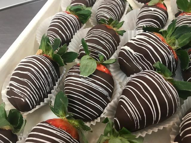 A fresh plump strawberry dipped in rich dark chocolate, milk chocolate, or white chocolate with drizzle!