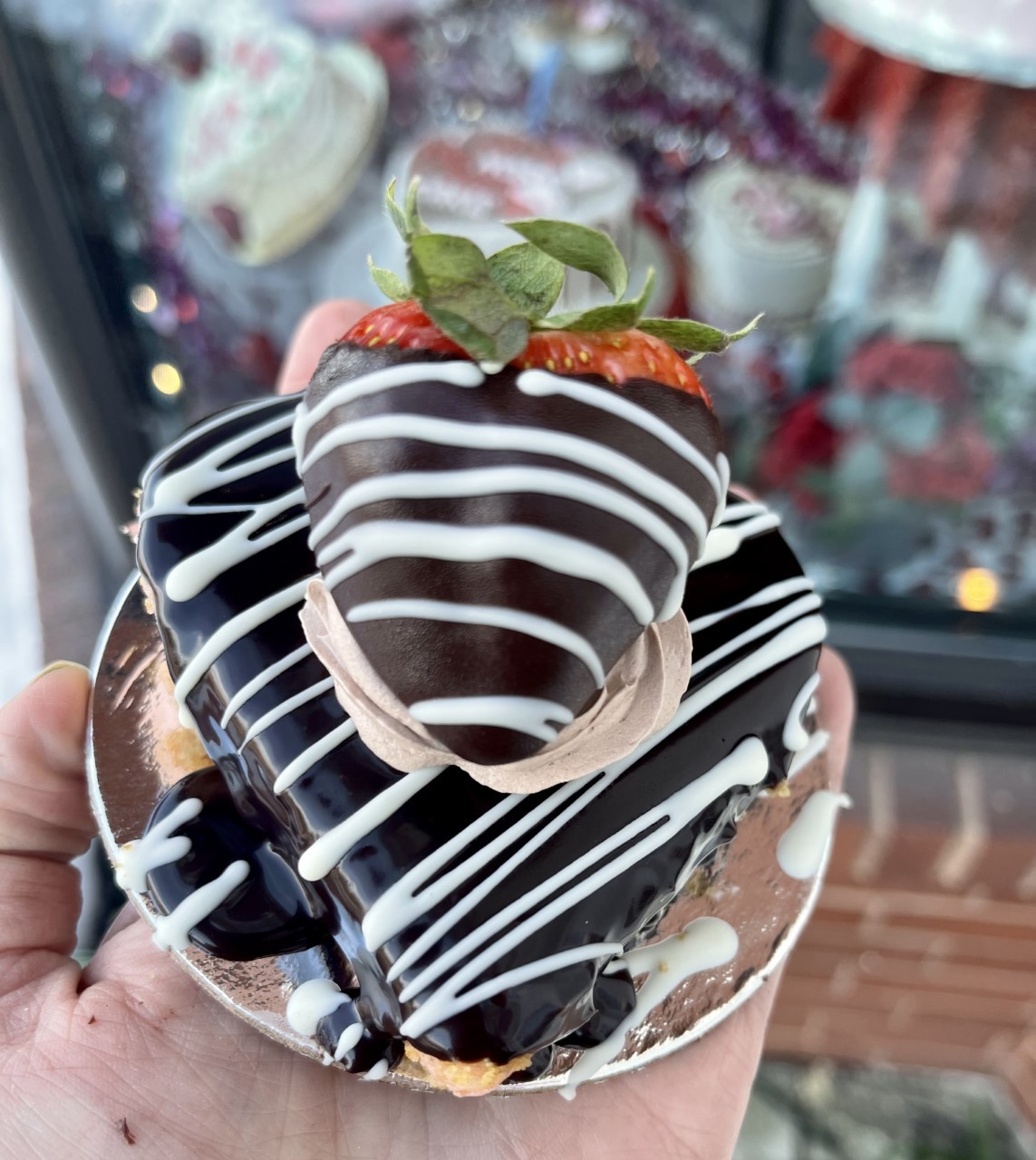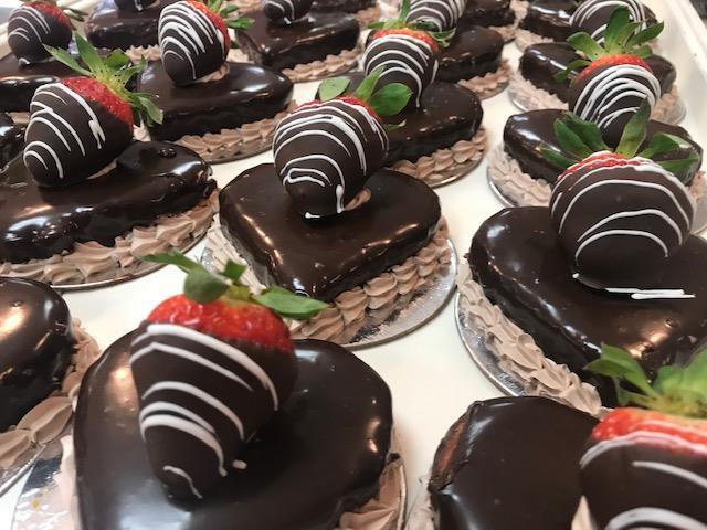 An individual heart- shaped strawberry flavored cheesecake, covered with chocolate ganache and garnished with a chocolate covered strawberry.