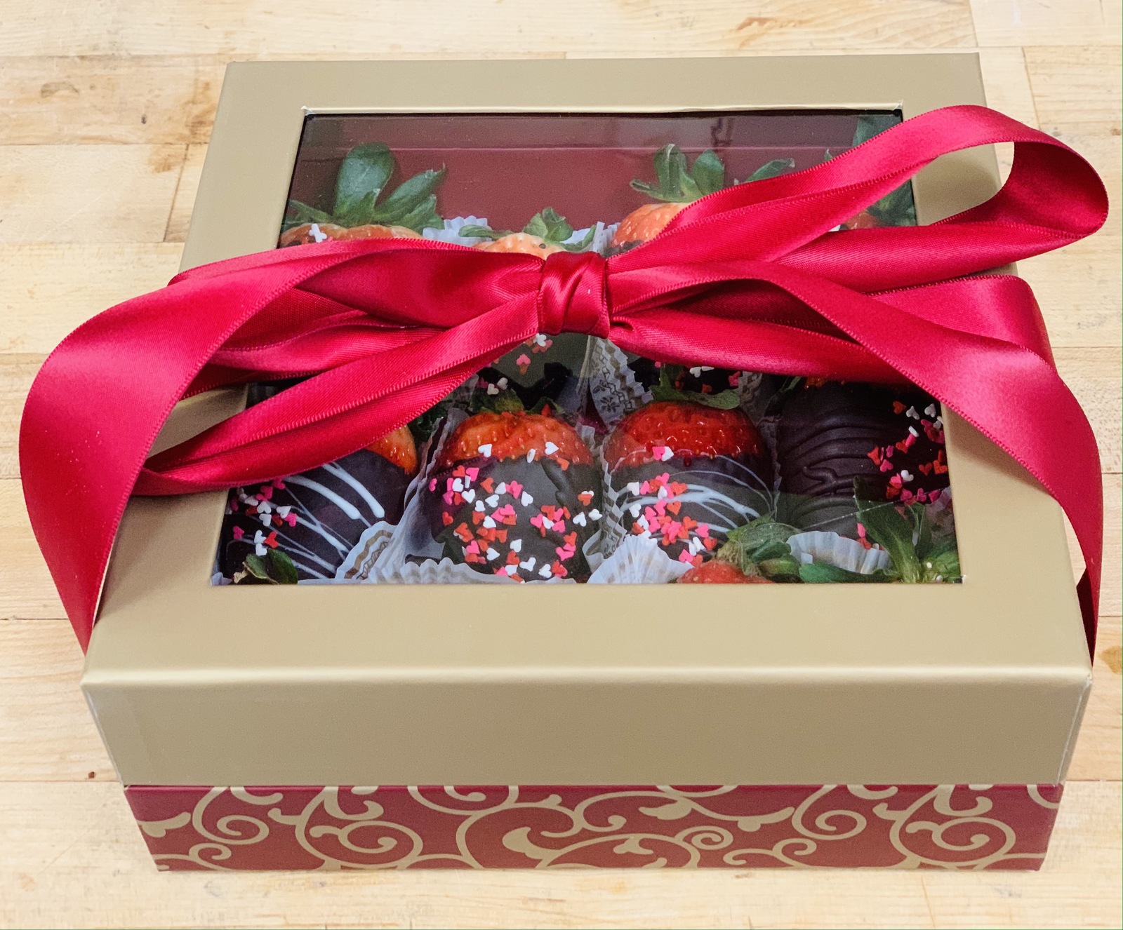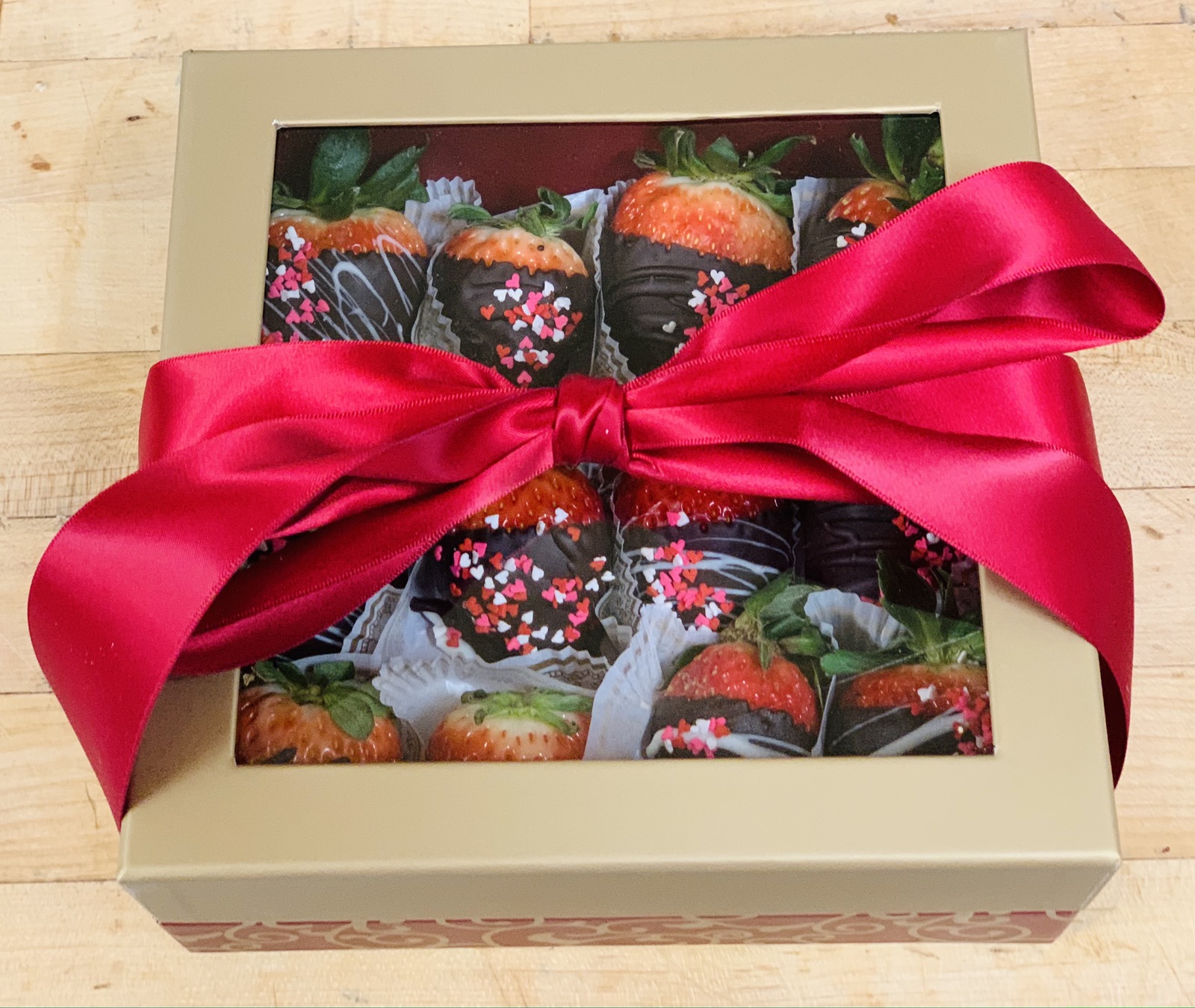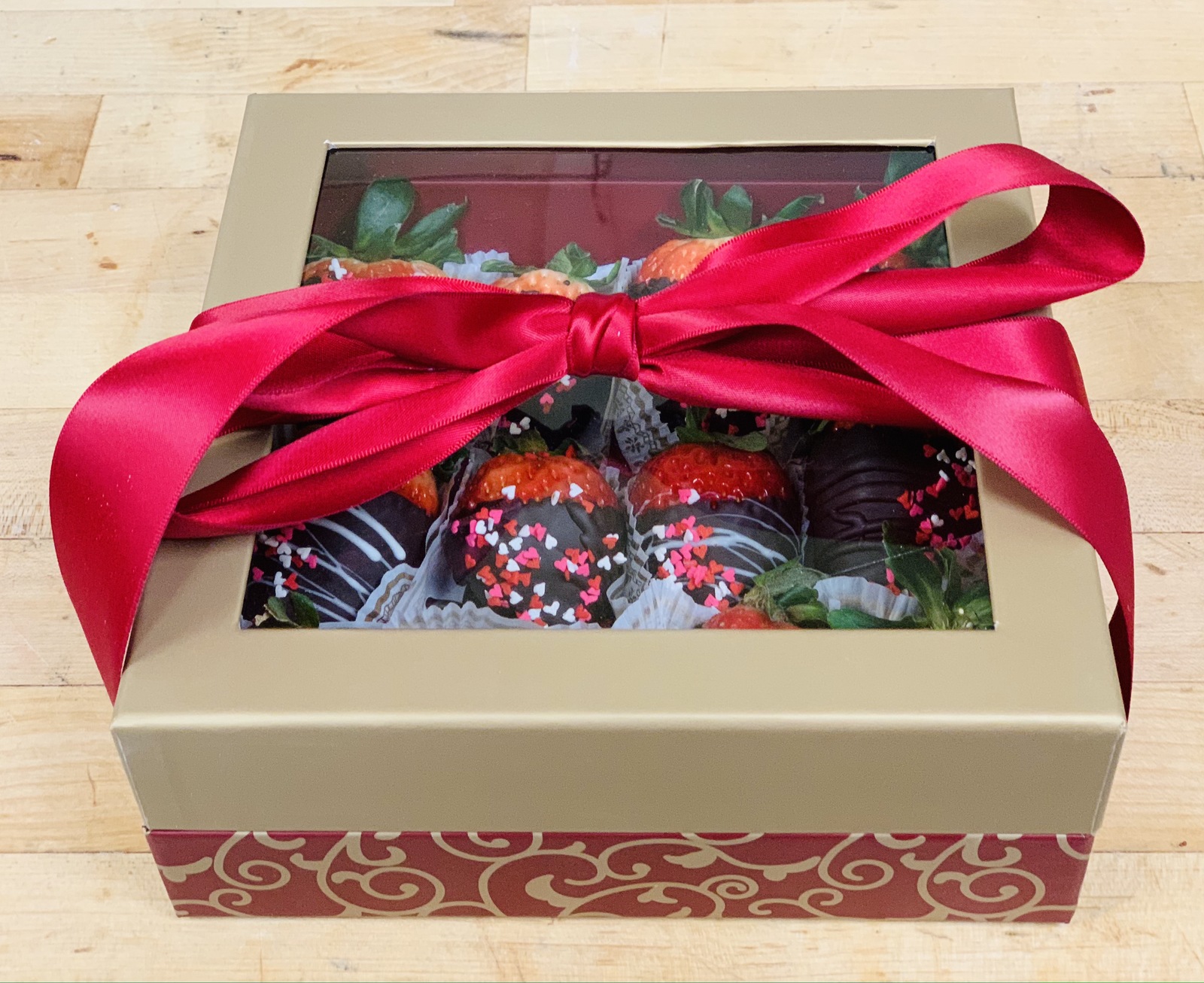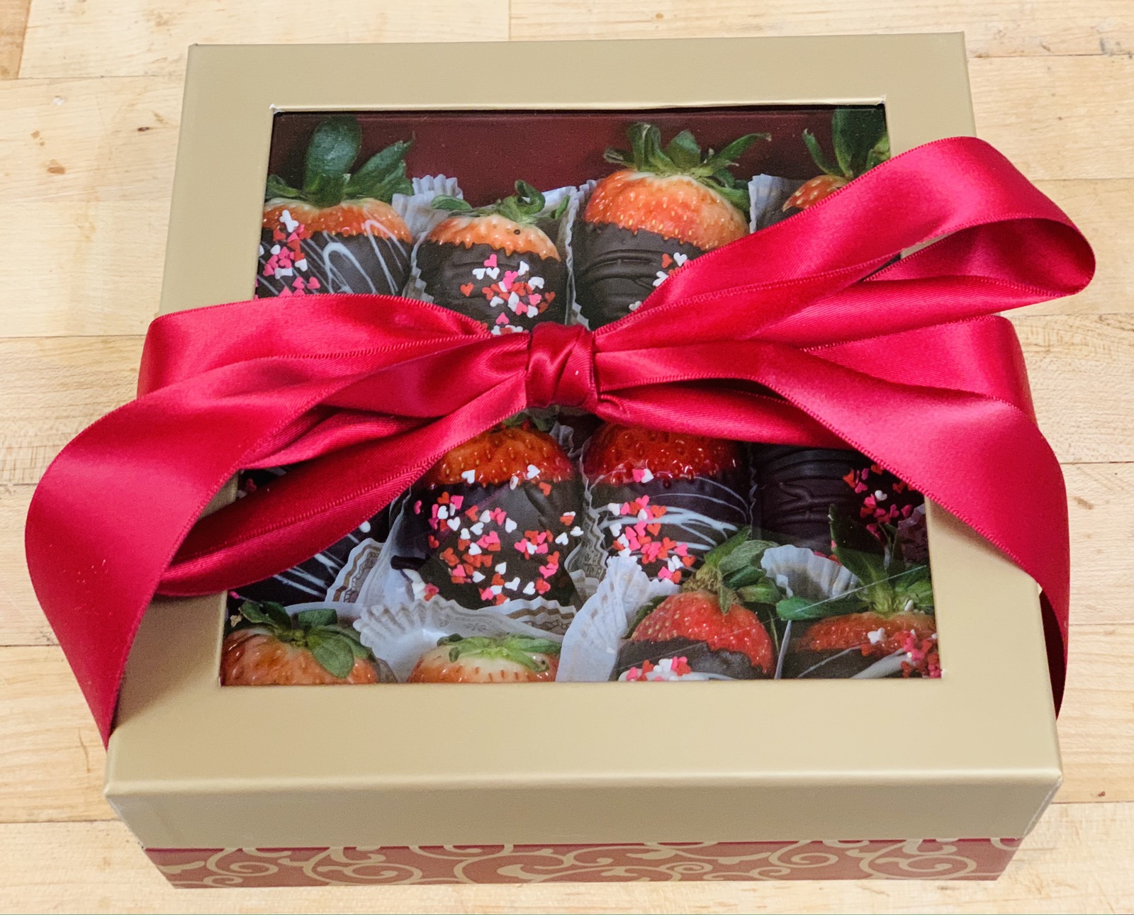 One dozen assorted Chocolate-covered Strawberries, displayed in a window gift box with ribbon. The perfect gift for your Valentine!