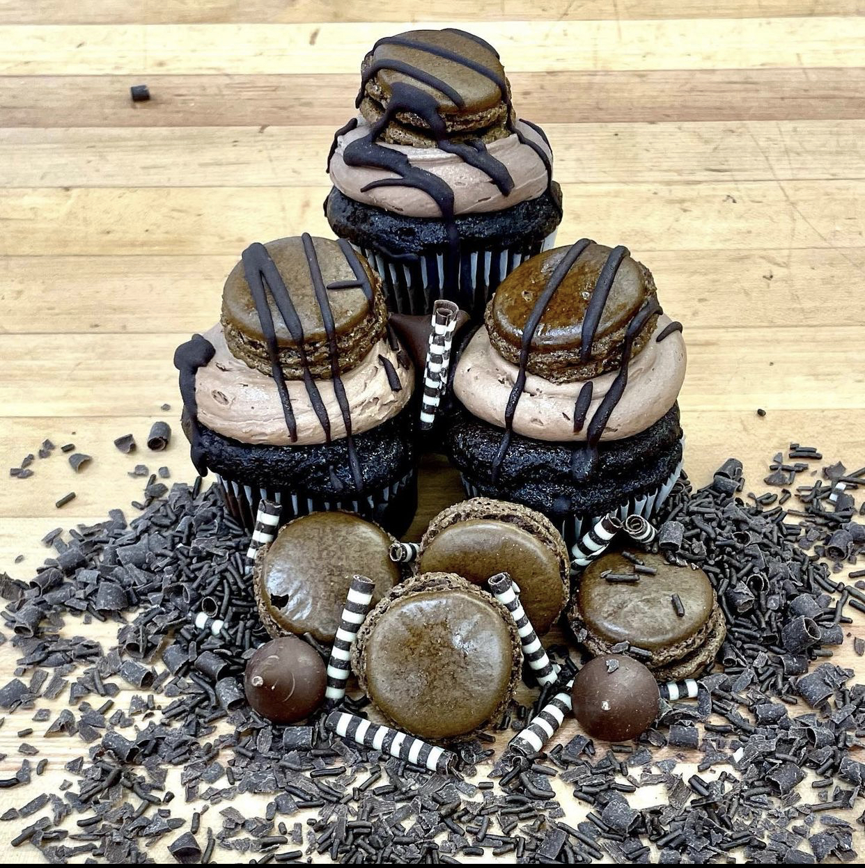 Our chocolate cake, filled with chocolate mousse, topped with a swirl of chocolate buttercream, & garnished with chocolate drizzle & a mini chocolate French macaron.