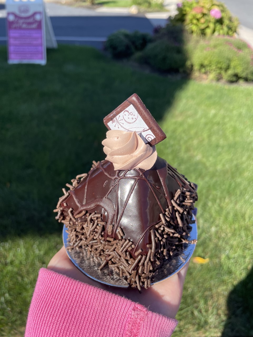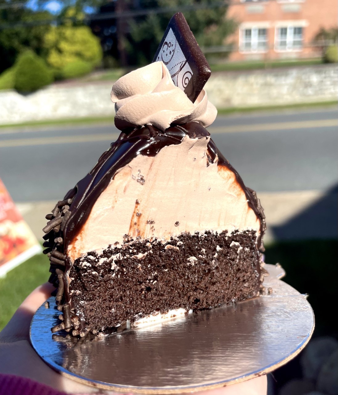 A thick layer of chocolate cake, topped with chocolate mousse, covered in chocolate ganache, and garnished with a chocolate piece.