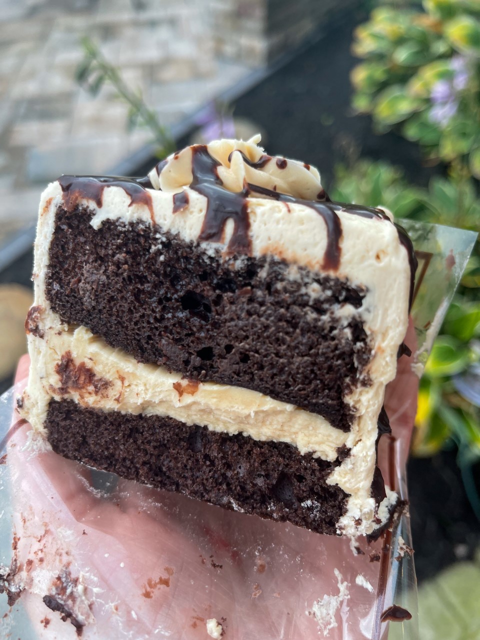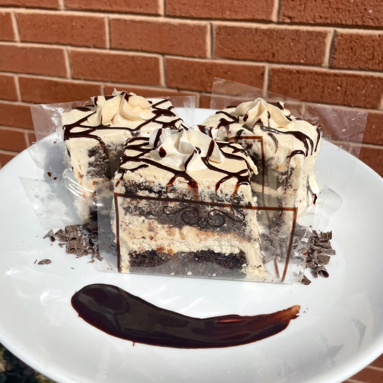 Layers of our moist chocolate cake, filled and iced with our peanut butter buttercream and garnished with a drizzle of chocolate.