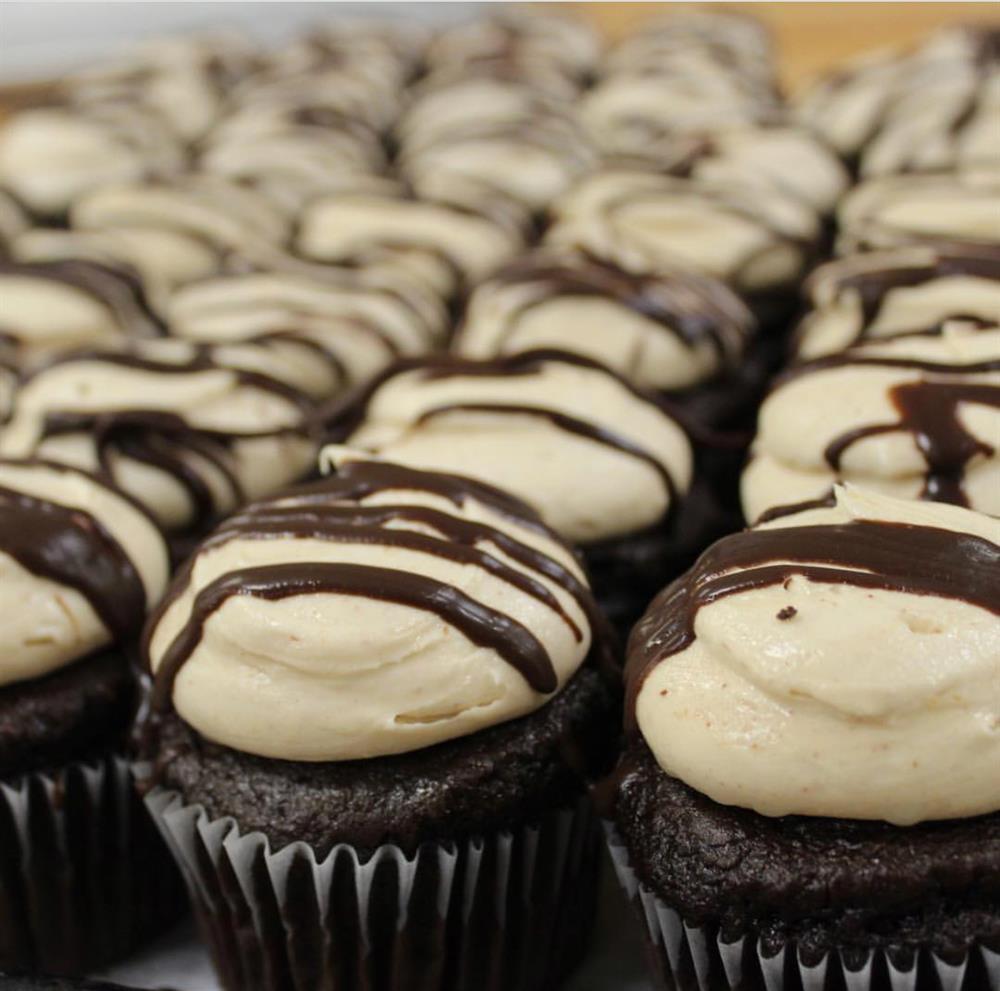 Chocolate cupcake topped with peanut butter icing and drizzled chocolate.
