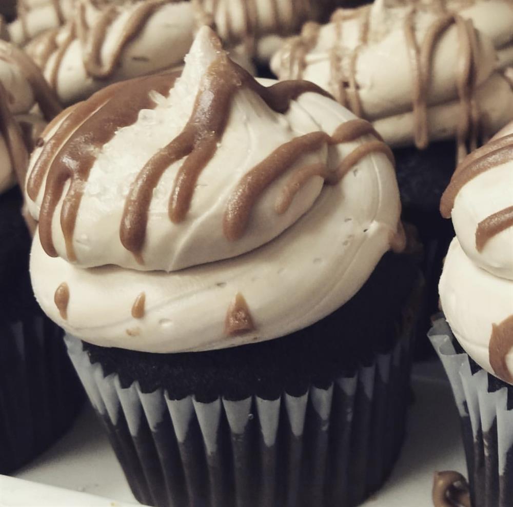 A moist chocolate cupcake topped with salted caramel buttercream, drizzled with caramel, and sprinkled with sea salt. The perfect blend of sweet and salty!