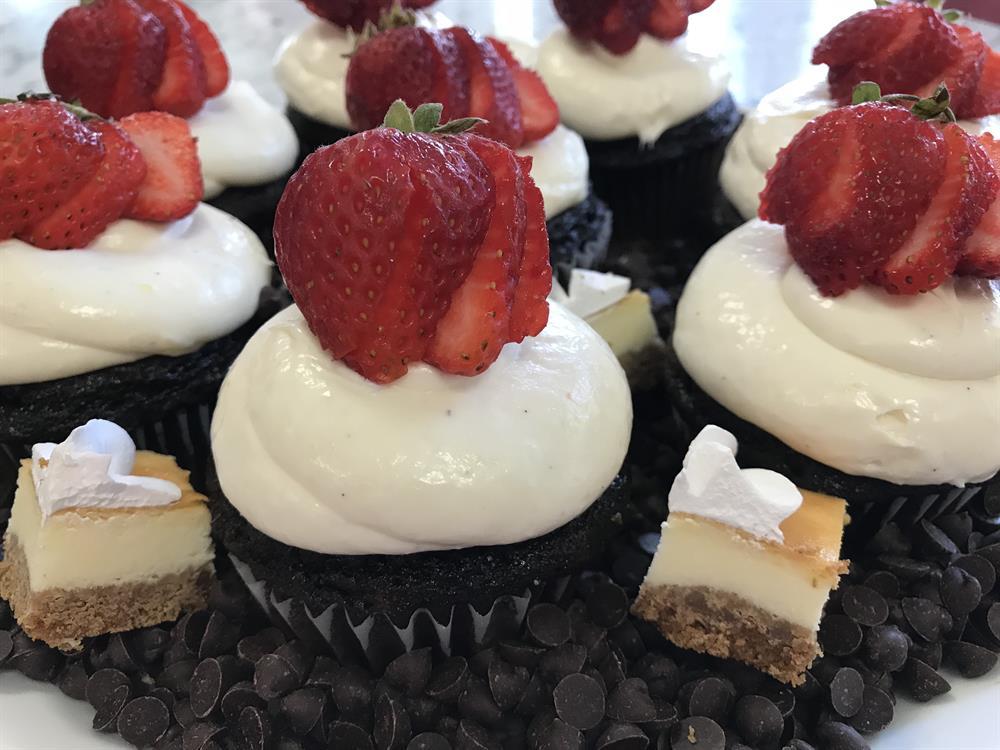 A chocolate cake, filled with strawberry filling, and topped with a creamy cheesecake icing, and garnished with a fresh strawberry.