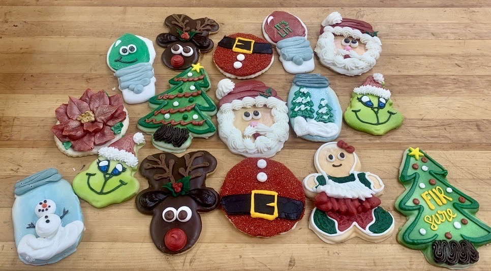 A dozen of our Assorted Christmas Decorated Cookies. Each cookie is a buttery sugar cookie, topped with white chocolate, and hand-decorated with buttercream.