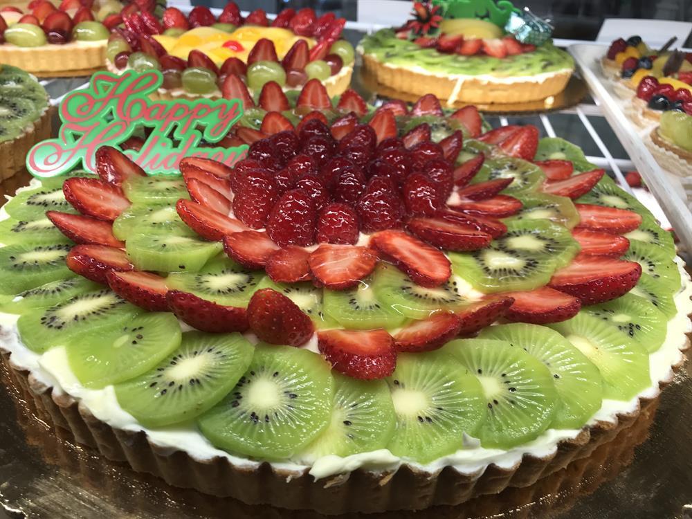 A 10 inch buttery tart shell, filled with smooth and creamy French custard, topped with arranged red and green fresh fruit, and an apricot glaze to give a shine. Serves 8-10.