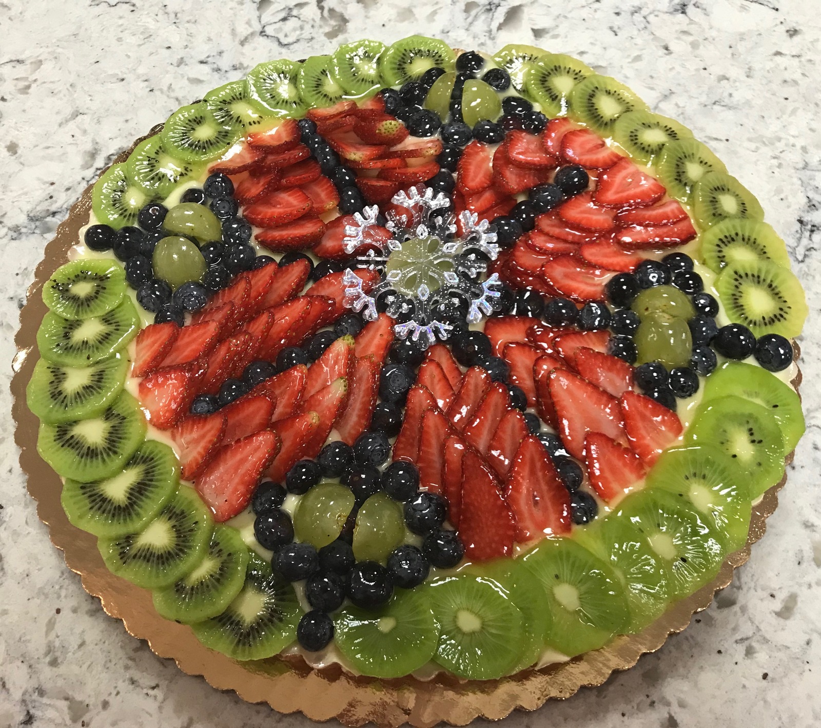 A 10 inch buttery tart shell, filled with smooth and creamy French custard, topped with arranged fresh fruit to look like a snowflake, and an apricot glaze to give a shine. Serves 8-10.
