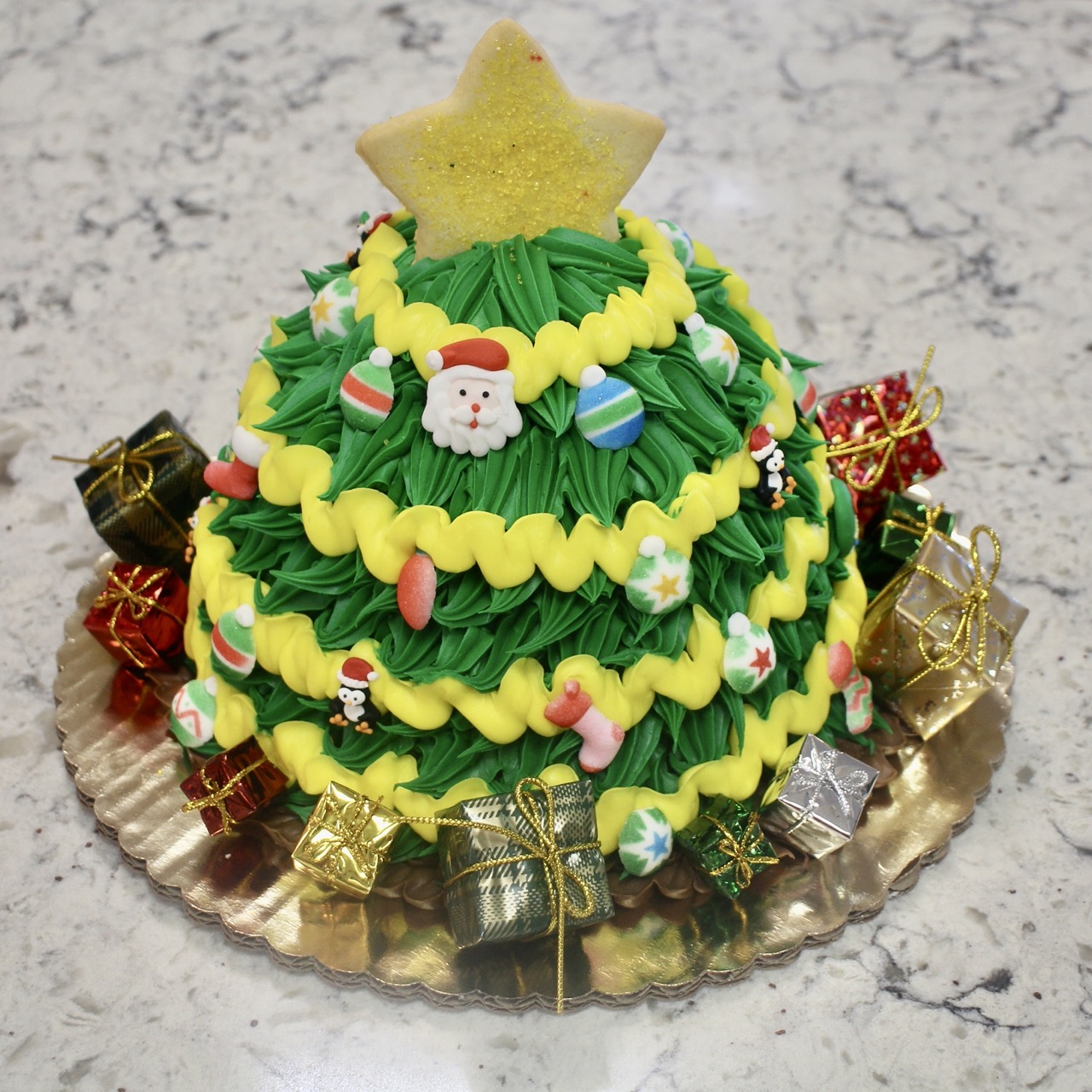 An 8 inch shaped cake (standard flavors available: yellow, chocolate, marble, or 1/2 and 1/2 (layer of each)), iced in buttercream and decorated to look like a Christmas tree. Please indicate cake flavor when ordering. Serves 8-10+.