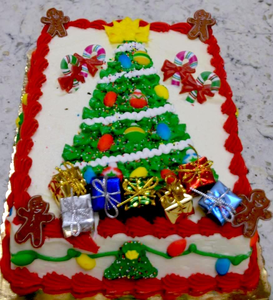 A 1/4 sheet cake (serves 15-24) (standard flavors available: yellow, chocolate, marble, or 1/2 and 1/2 (layer of each)), iced in buttercream and decorated with hand-piped Christmas Tree. Please indicate cake flavor when ordering.