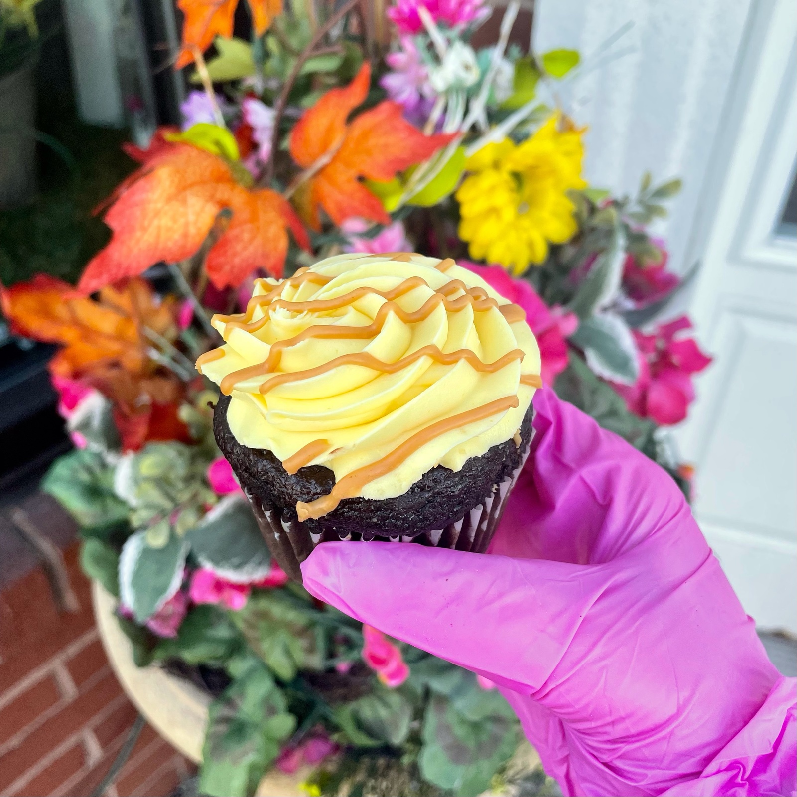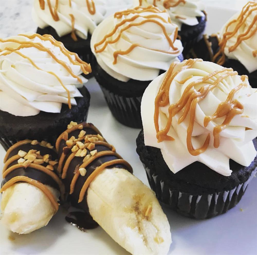 A chocolate cupcake, filled with a peanut butter buttercream, iced in a banana buttercream, and drizzled with peanut butter.