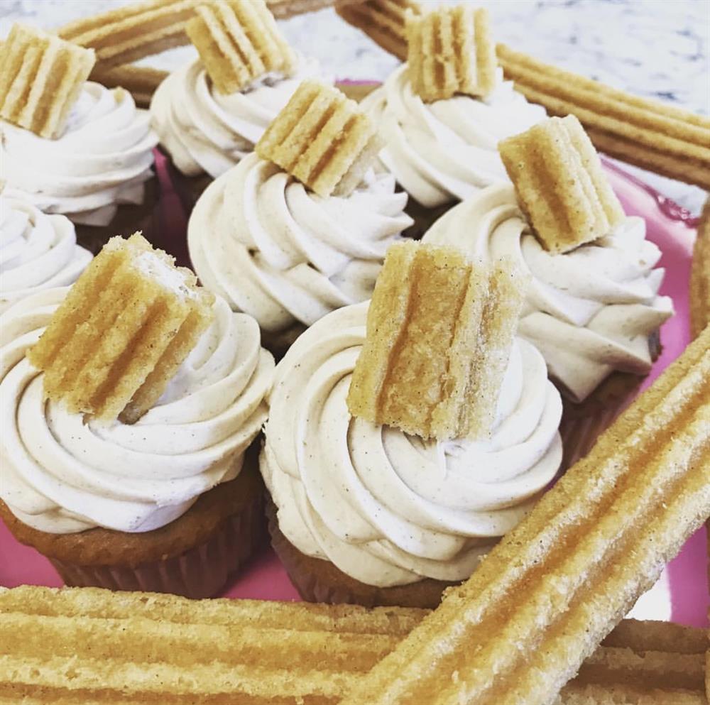 A delectable yellow cake topped with a swirl of cinnamon cream cheese and a real piece of churro.