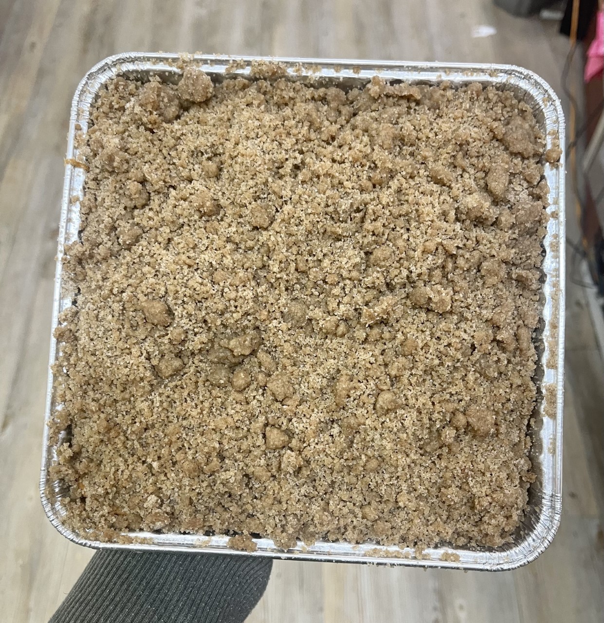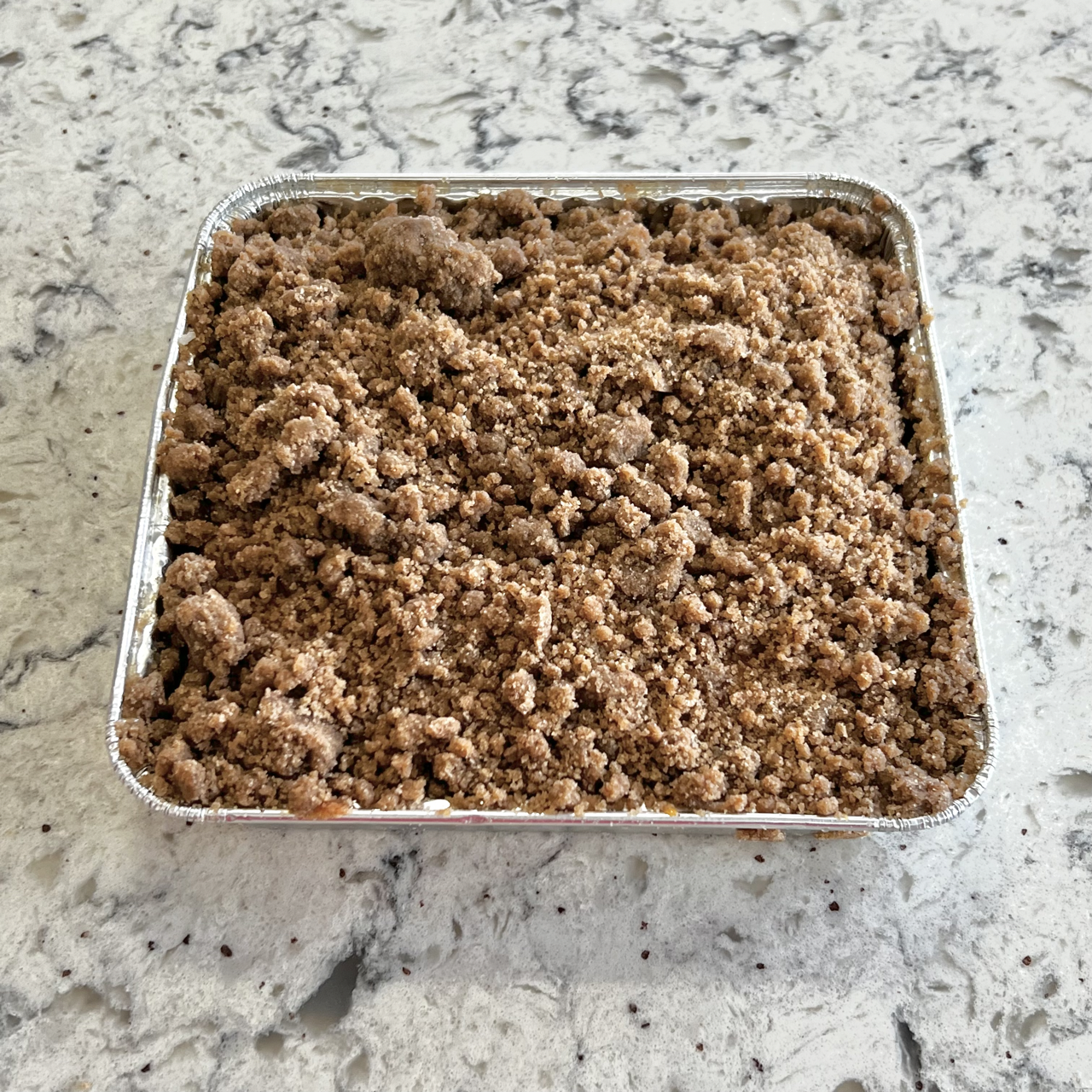 This cinnamon coffee cake has moist vanilla cake, a rich cinnamon swirl, and an irresistible crumb topping. This is heavy on the crumb topping because let’s be honest that’s my favorite part. You’ll get some in every single bite. Only available in a 8x8 pan.