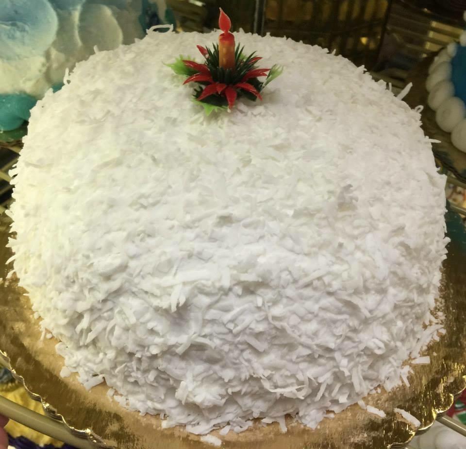 An 8 inch dome-shaped cake (standard flavors available: yellow, chocolate, marble, or 1/2 and 1/2 (layer of each)), iced in buttercream and covered in coconut to resemble a snowball. Please indicate cake flavor when ordering.