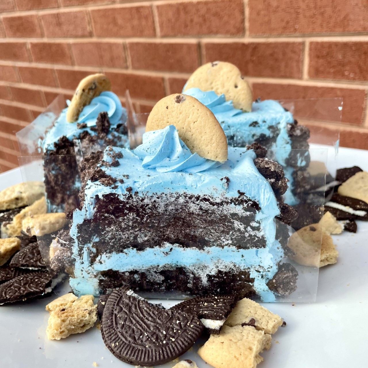 Our large cake slice of our delicious cookie monster cake: A chocolate cake, with a blue colored cookies and cream mousse icing and filling. Topped and rolled in Oreo cookies and mini chocolate chip cookies.
