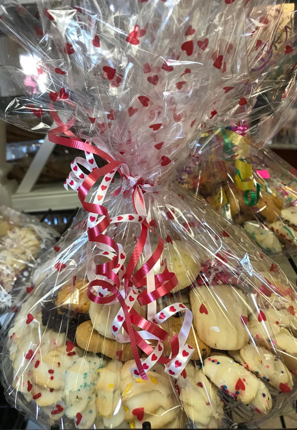 2.5 LB's (80-100 small cookies) of our assorted Butter Tea Cookies, on a tray, and wrapped and ribboned for Valentine's Day.