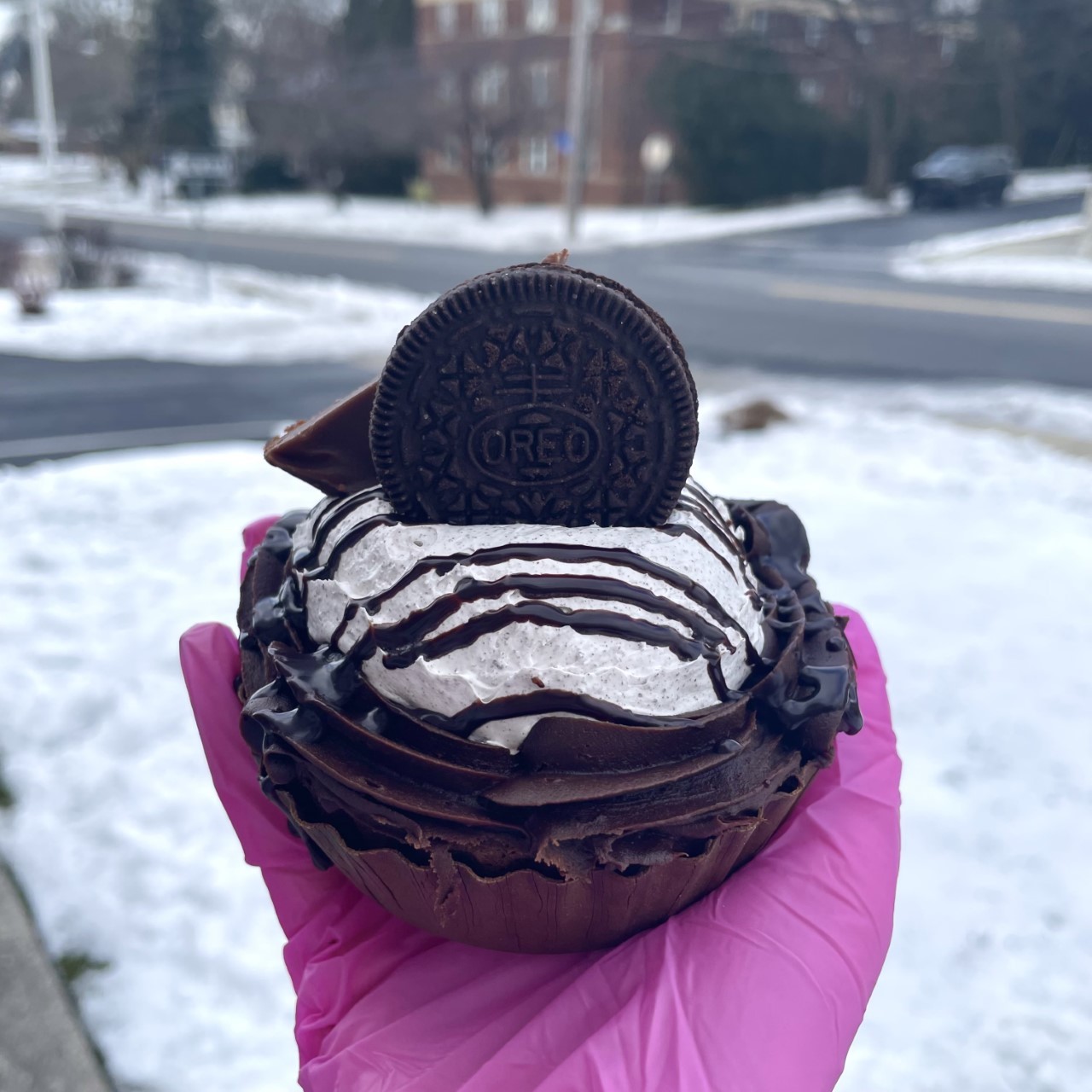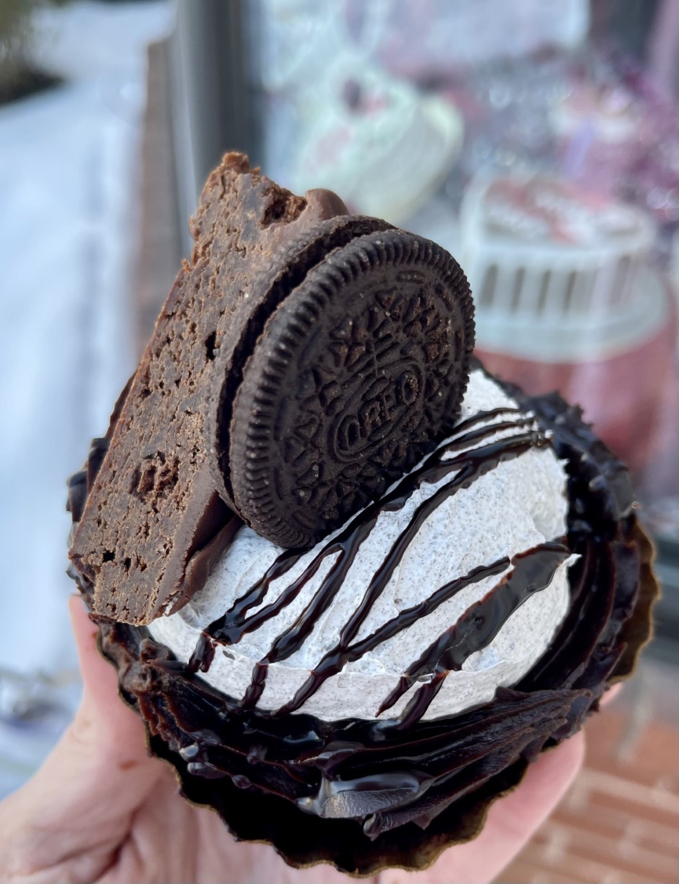 A thick layer of brownie topped with cookies and cream mousse and chocolate fudge icing, drizzled with chocolate ganache and topped with a brownie piece and Oreo cookie.