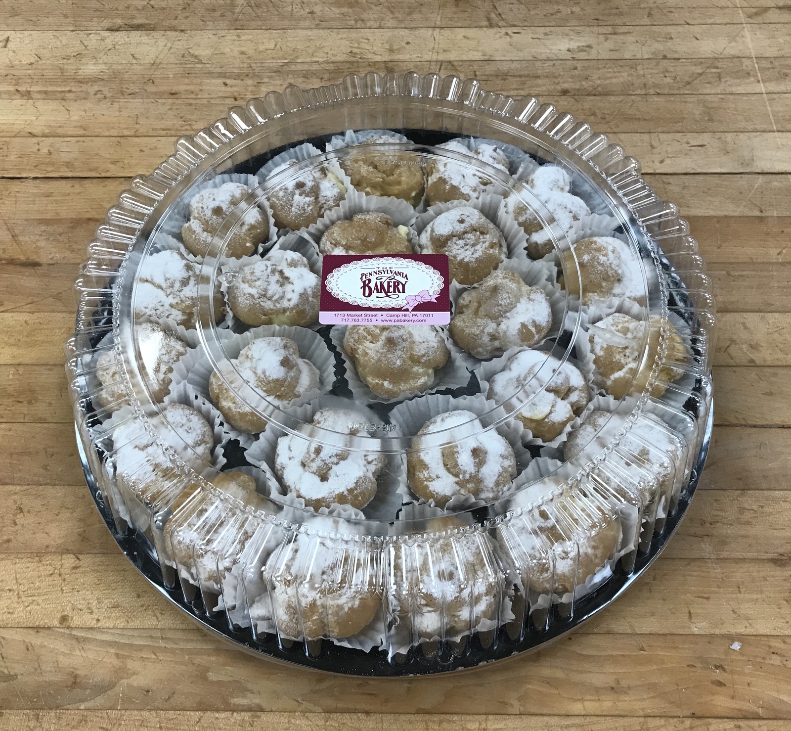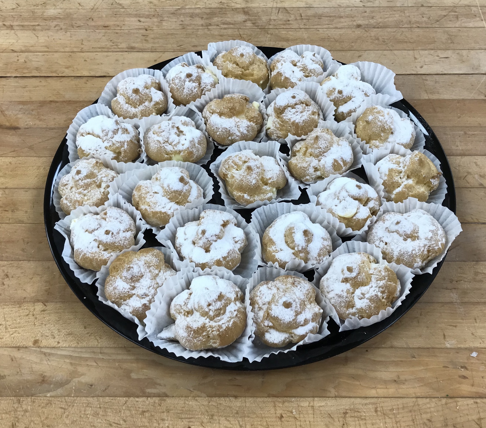 An assortment of 2 dozen of our mini cream puffs, all served on a catering tray. Perfect bite-size little treats for any gathering.