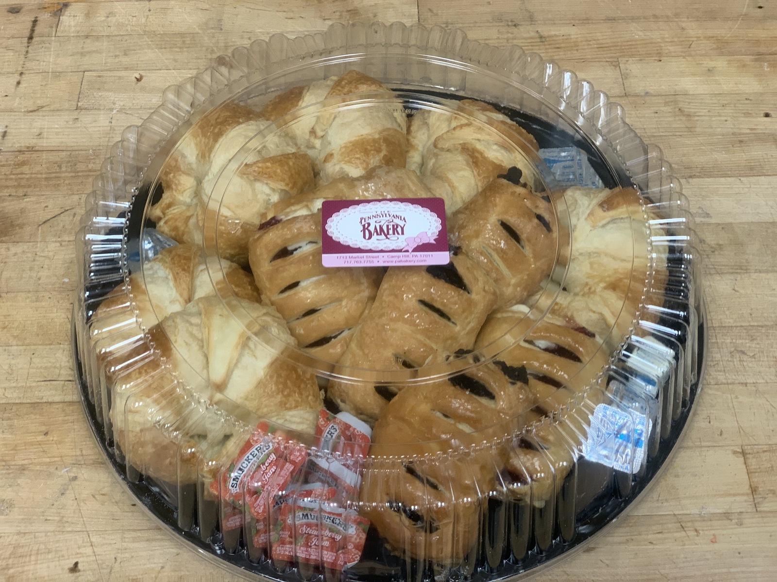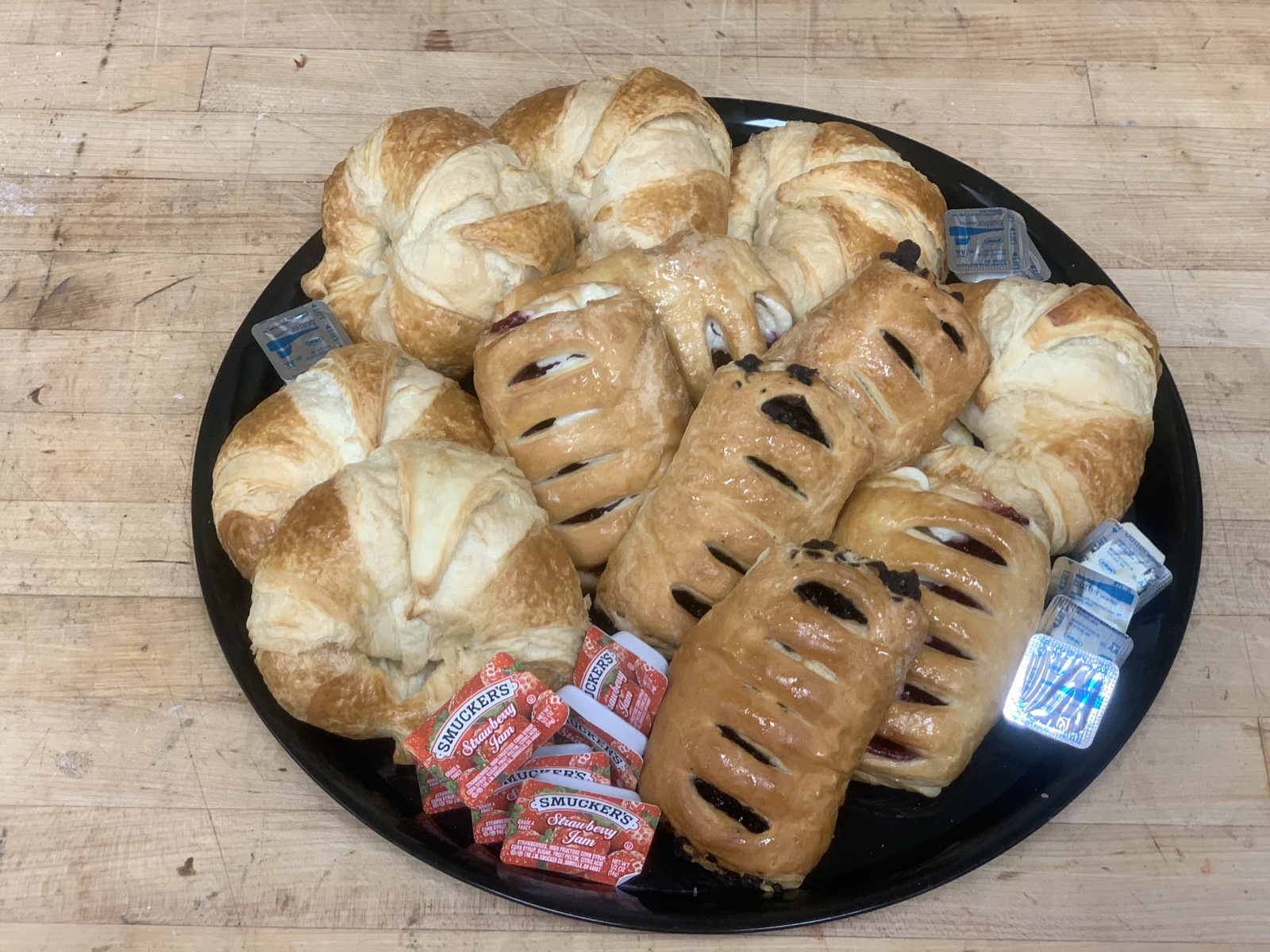 An assortment of our Butter Croissant Varieties all served on a catering tray. Includes 6 butter croissants, 3 chocolate-filled croissants, & 3 strawberry cream cheese filled croissants. Also includes an assortment of butter & jelly packets. Perfect for a breakfast or brunch gathering.
