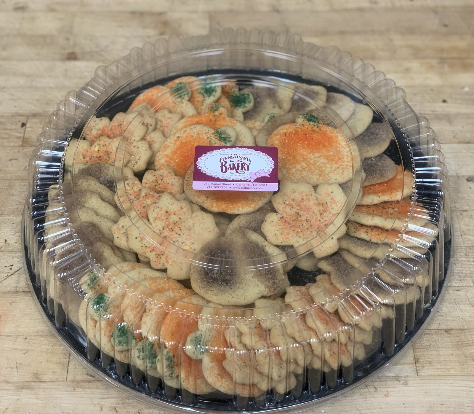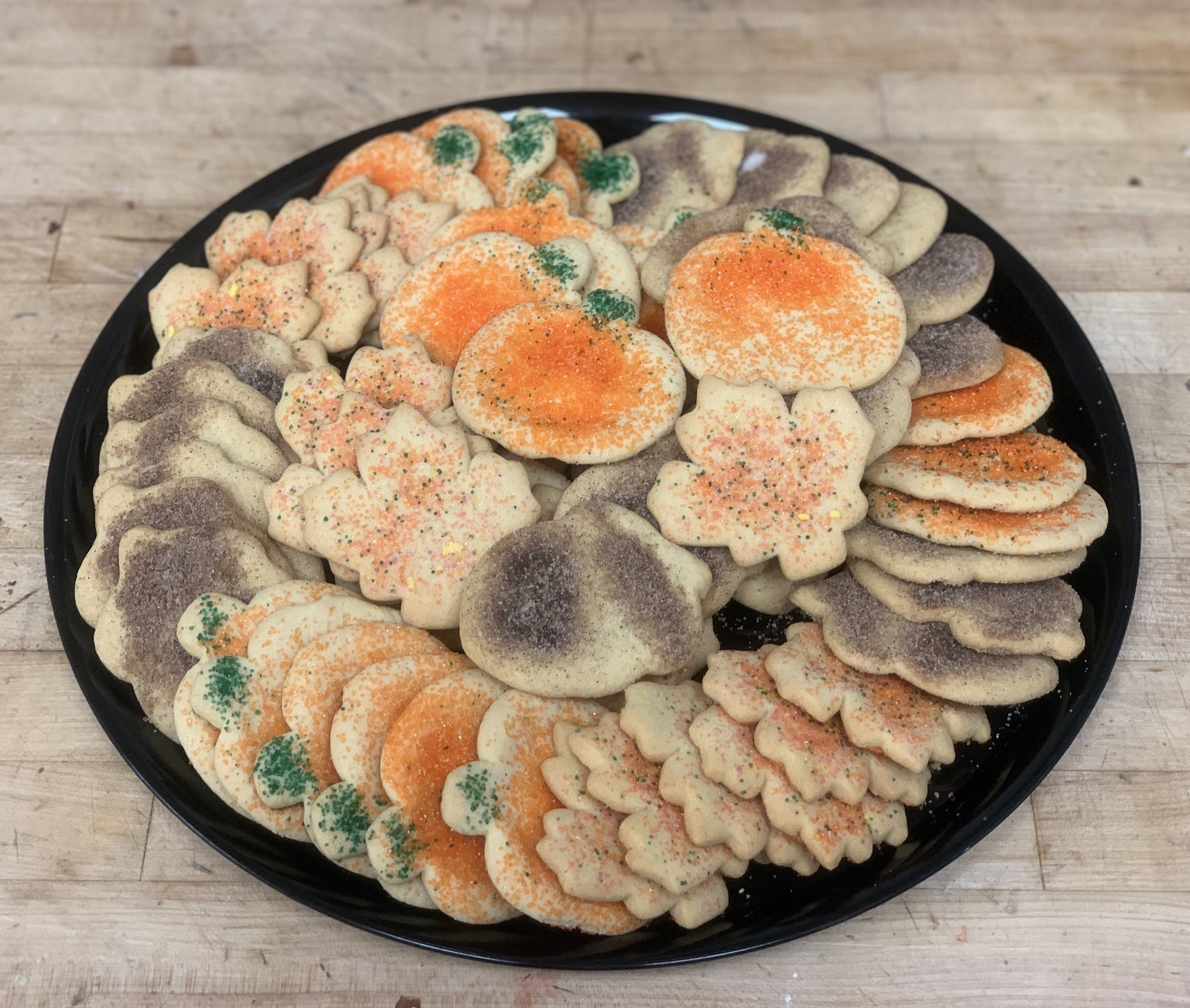 An assortment of 5 dozen of our cut-out sugar cookies, all served on a catering tray. A buttery sugar cookie, with various shapes & colors based on the season. Perfect treats for any gathering.
