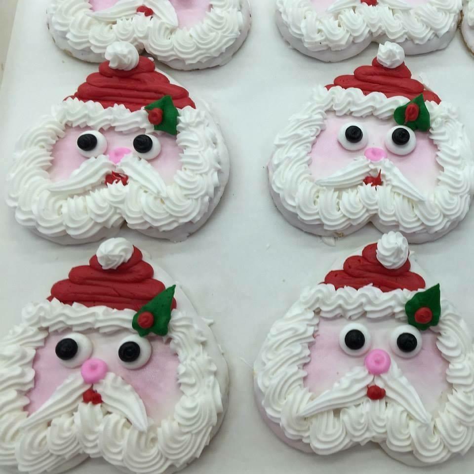 A half dozen of our Santa Face Decorated Cookies. Each cookie is a buttery sugar cookie, topped with white chocolate, and hand-decorated with buttercream.