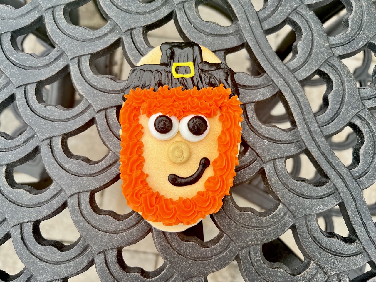 Our shamrock-shaped sugar cookie, topped with white chocolate, and hand-decorated with buttercream icing.