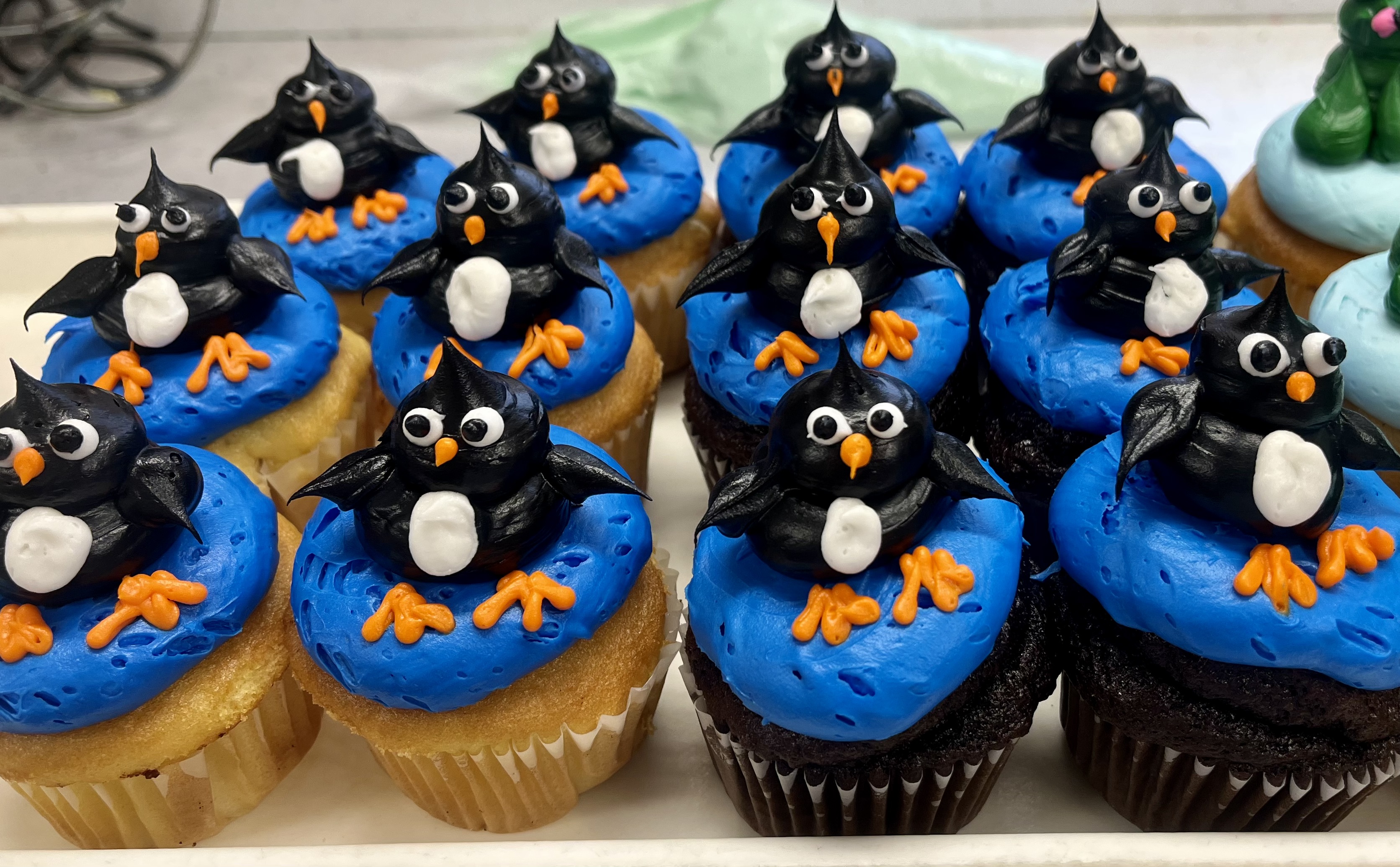 A cupcake topped with a piped penguin; available in chocolate or yellow cake.